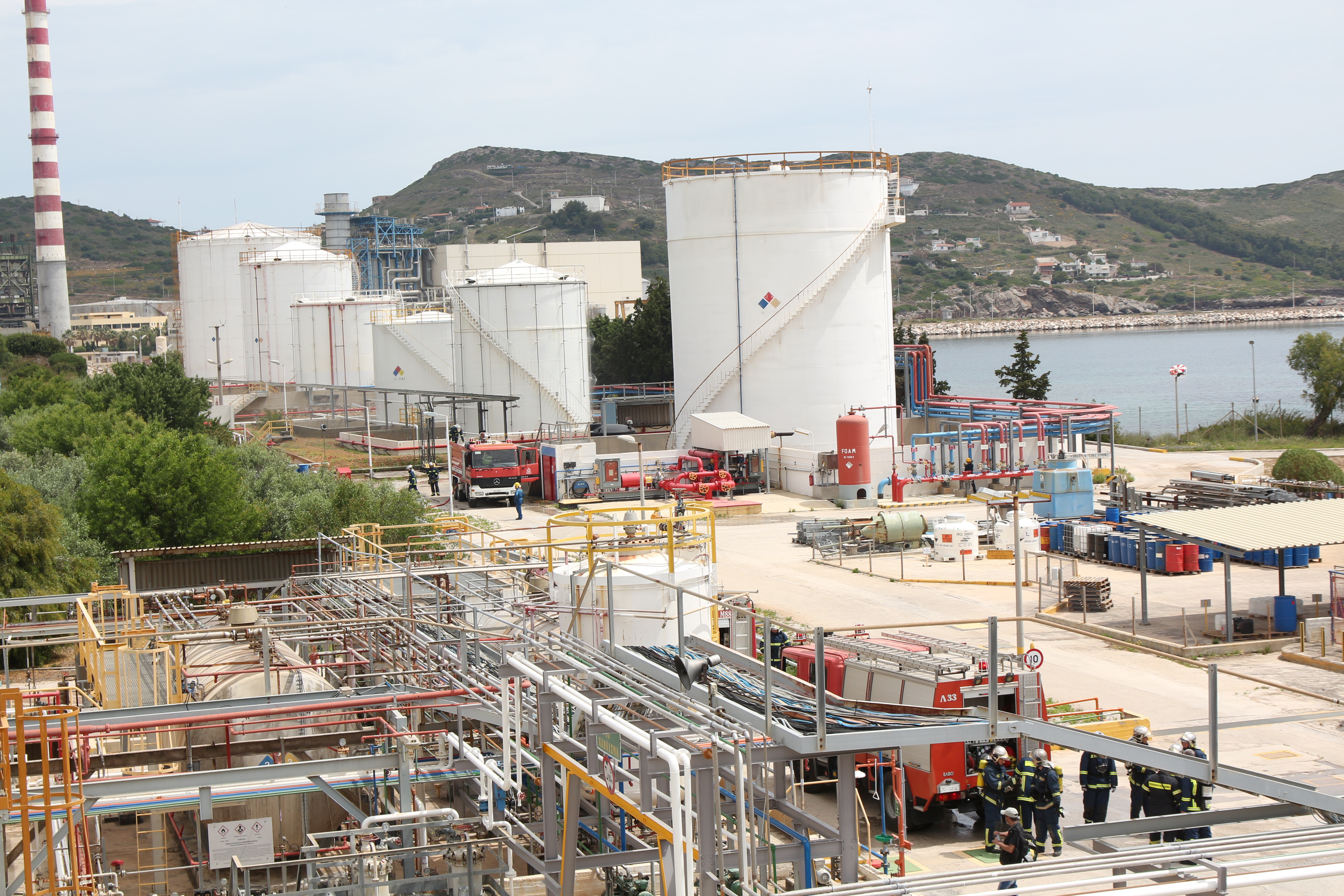 Σύμφωνα με το σενάριο, κατά τη διάρκεια πλήρωσης μιας δεξαμενής με στυρένιο, υπήρξε διαρροή και πρόκληση πυρκαγιάς στη δεξαμενή και στη λεκάνη ασφαλείας της. Το γεγονός αυτό δημιούργησε φωτιά πυρσού και λίμνης (POOL FIRE), που επηρέασε παρακείμενες δεξαμενές και προκάλεσε πυρκαγιά και σε δεξαμενή αποθήκευσης πετρελαίου (diesel). Άμεσα ενεργοποιήθηκαν τα συστήματα πυροπροστασίας της επιχείρησης και ειδοποιήθηκε η Πυροσβεστική Υπηρεσία. Επίσης, κινητοποιήθηκε και η ομάδα πυρασφάλειας της εταιρίας, δύο υπάλληλοι της οποίας, τραυματίστηκαν και εγκλωβίστηκαν στο σημείο στην προσπάθειά τους να κατασβήσουν την πυρκαγιά. Οι πυροσβεστικές δυνάμεις της Π.Υ. Λαυρίου με την άφιξή τους στο σημείο, προέβησαν στις προβλεπόμενες ενέργειες για τη διάσωση των τραυματιών και ταυτόχρονα για τη κατάσβεση της πυρκαγιάς στις δεξαμενές με αυλούς οροφής και χρήση αφρογόνου υλικού. Οι δυνάμεις ενισχύθηκαν από την 1η Ε.Μ.Α.Κ., την Π.Υ. Μαρκοπούλου και την Π.Υ. Κορωπίου, ενώ υπήρξε και κινητοποίηση των υπόλοιπων φορέων, δεδομένου ότι το περιστατικό είχε λάβει πλέον διαστάσεις Βιομηχανικού Ατυχήματος Μεγάλης Έκτασης (Β.Α.Μ.Ε.).