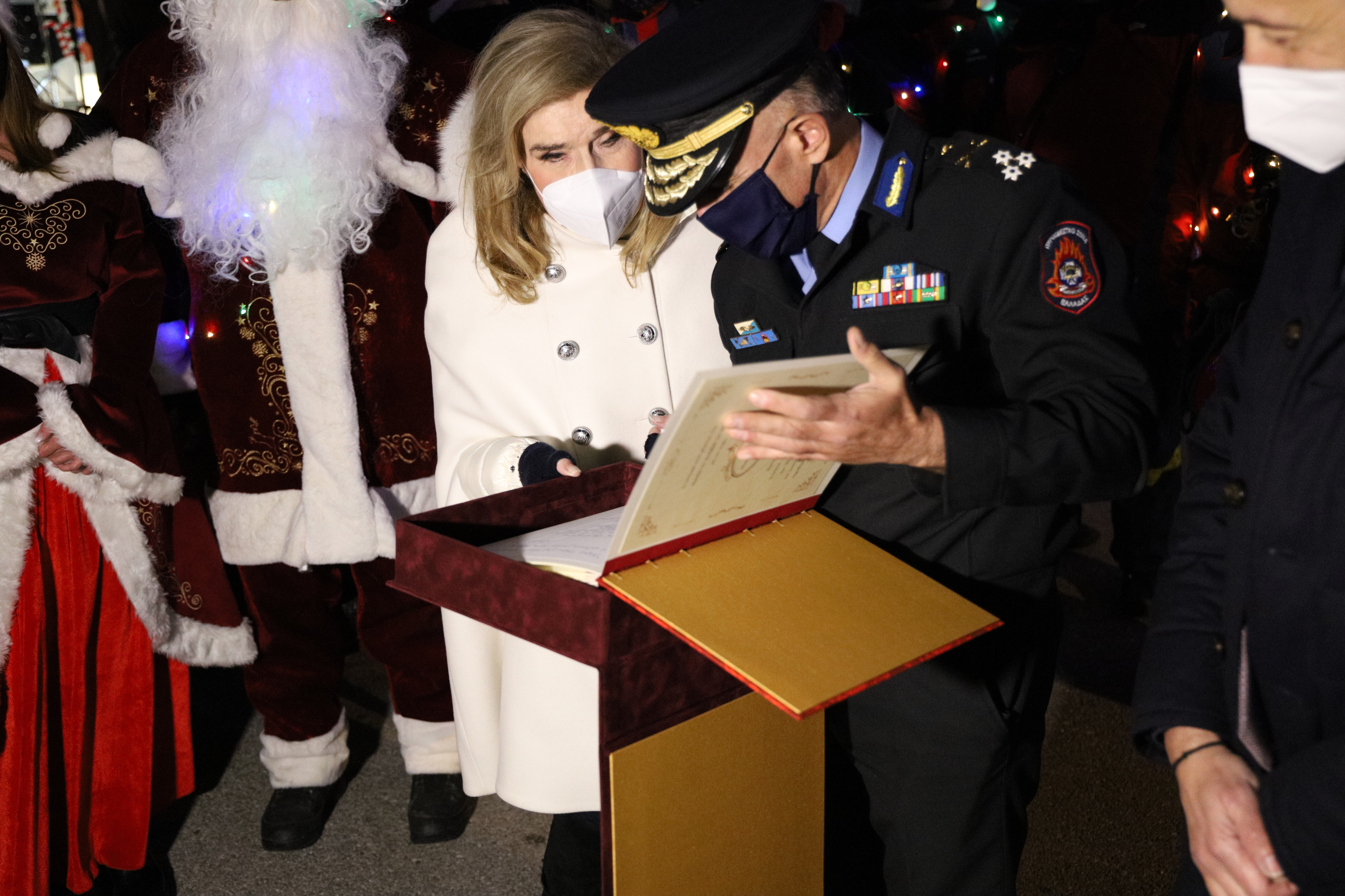 Τον «Άγιο Βασίλη» που κατέβηκε από την πυροσβεστική κλίμακα στον προαύλιο χώρο της Μονάδας υποδέχτηκαν η πρόεδρος του Σωματείου ΕΛΠΙΔΑ – Σύλλογος φίλων παιδιών με καρκίνο κ. Μαριάννα Βαρδινογιάννη μαζί με μικρούς ασθενείς και με τον Υπουργό Υγείας Θάνο Πλεύρη, τον Κοσμήτορα της Βουλής των Ελλήνων και βουλευτή Δωδεκανήσου Βασίλειο - Νικόλαο Υψηλάντη, τον Αρχηγό του Πυροσβεστικού Σώματος Αντιστράτηγο Στέφανο Κολοκούρη καθώς και τον Διοικητή του νοσοκομείου Παίδων Αγία Σοφία και Π&Α Κυριακού Εμμανουήλ Παπασάββα.