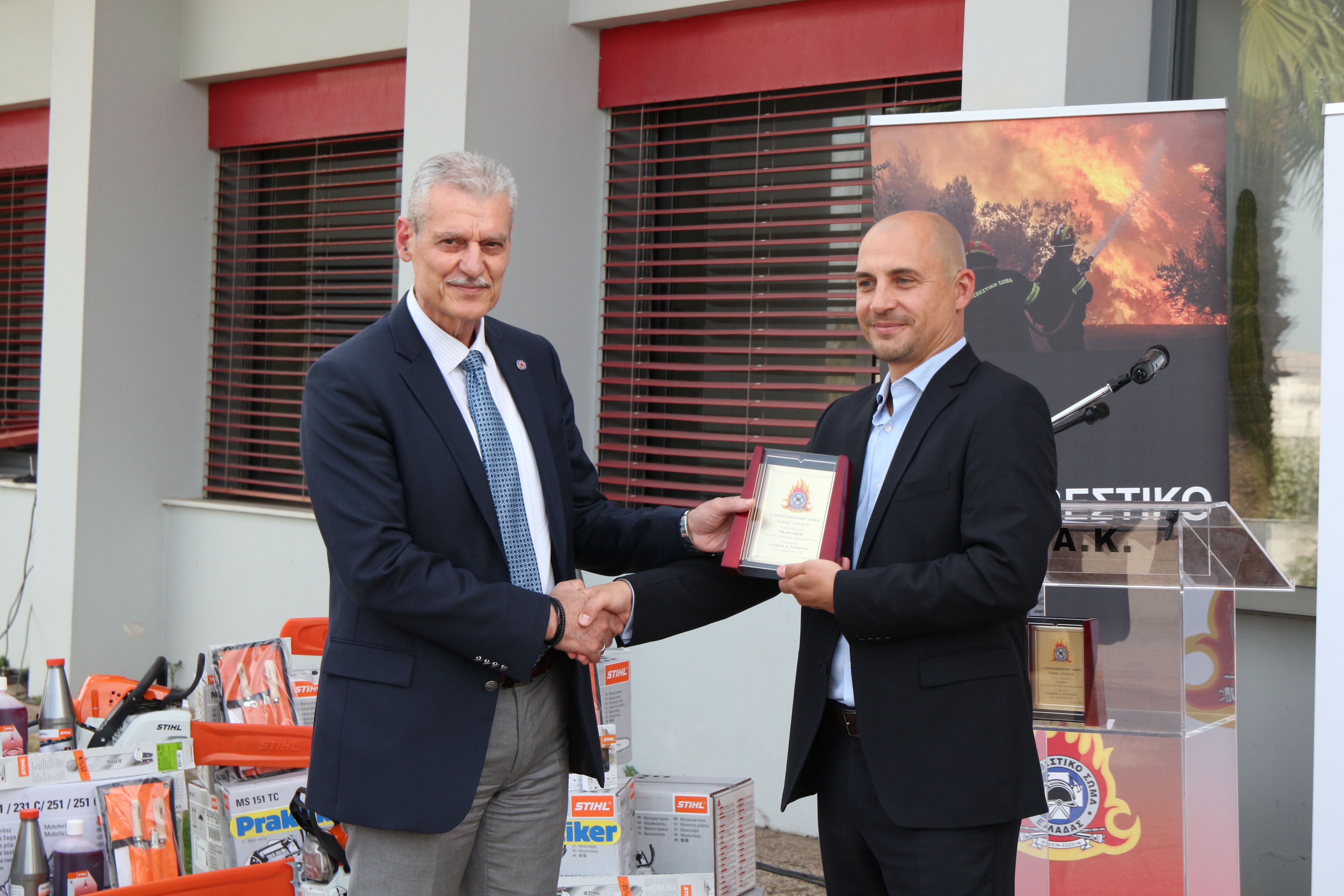 Στο τέλος της τελετής, ο Υφυπουργός Κλιματικής Κρίσης και Πολιτικής Προστασίας Ευάγγελος Τουρνάς και ο Αρχηγός του Πυροσβεστικού Σώματος Αντιστράτηγος Αλέξιος Ράπανος επέδωσαν αναμνηστικές πλακέτες στον Εμπορικό Διευθυντή της Praktiker Hellas Δημήτρη Μάγκο και στον Διευθύνοντα Σύμβουλο της Stihl Ηλία Ραβάνη.