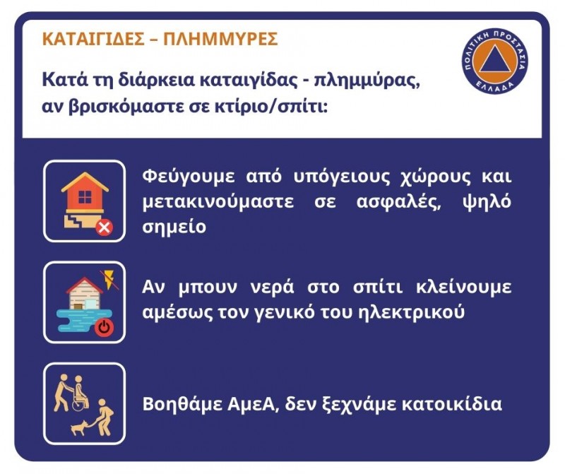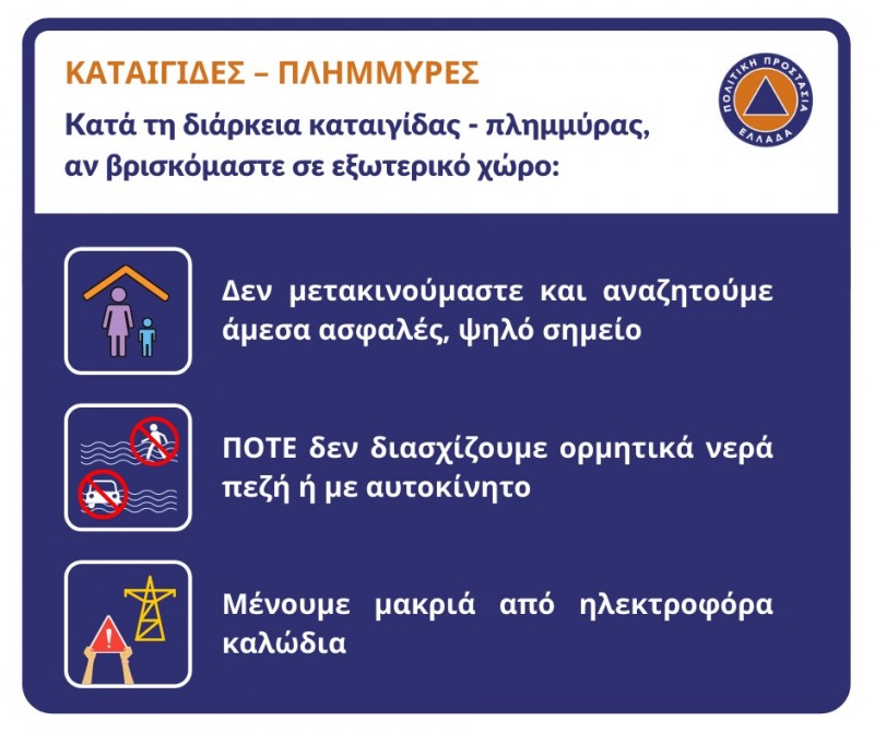 Για περισσότερες πληροφορίες και οδηγίες αυτοπροστασίας από τα έντονα καιρικά φαινόμενα, οι πολίτες μπορούν να επισκεφθούν την ιστοσελίδα του Υπουργείου Κλιματικής Κρίσης και Πολιτικής Προστασίας στην ηλεκτρονική διεύθυνση www.civilprotection.gr.