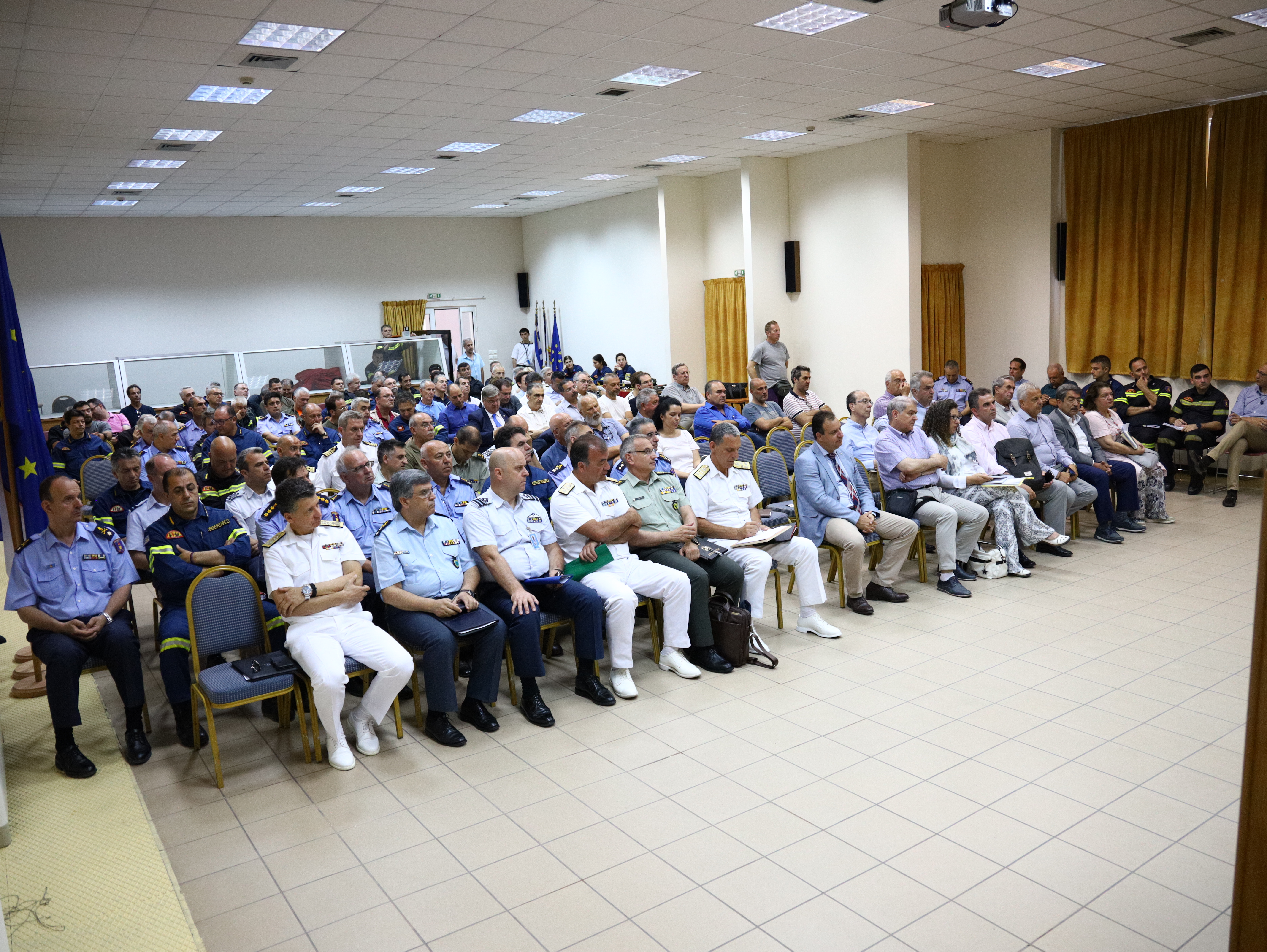 Από πλευράς του Πυροσβεστικού Σώματος συμμετείχαν ο Συντονιστής Υποστήριξης Επιτελείου Α.Π.Σ. Υποστράτηγος ΠΣ Αναστάσιος Σωτήρχος, ο Διοικητής Ενιαίου Συντονιστικού Κέντρου Επιχειρήσεων (Ε.Σ.Κ.Ε.) Υποστράτηγος ΠΣ Ιάκωβος Κλεφτοσπύρος, ο Διοικητής Περιφερειακής Πυροσβεστικής Διοίκησης Αττικής Υποστράτηγος ΠΣ Νικόλαος Σπαής, ο Συντονιστής Επιχειρήσεων με έδρα τον Πειραιά Υποστράτηγος ΠΣ Ιωάννης Πετρούτσος, καθώς και Ανώτατοι και Ανώτεροι Αξιωματικοί του Π.Σ.