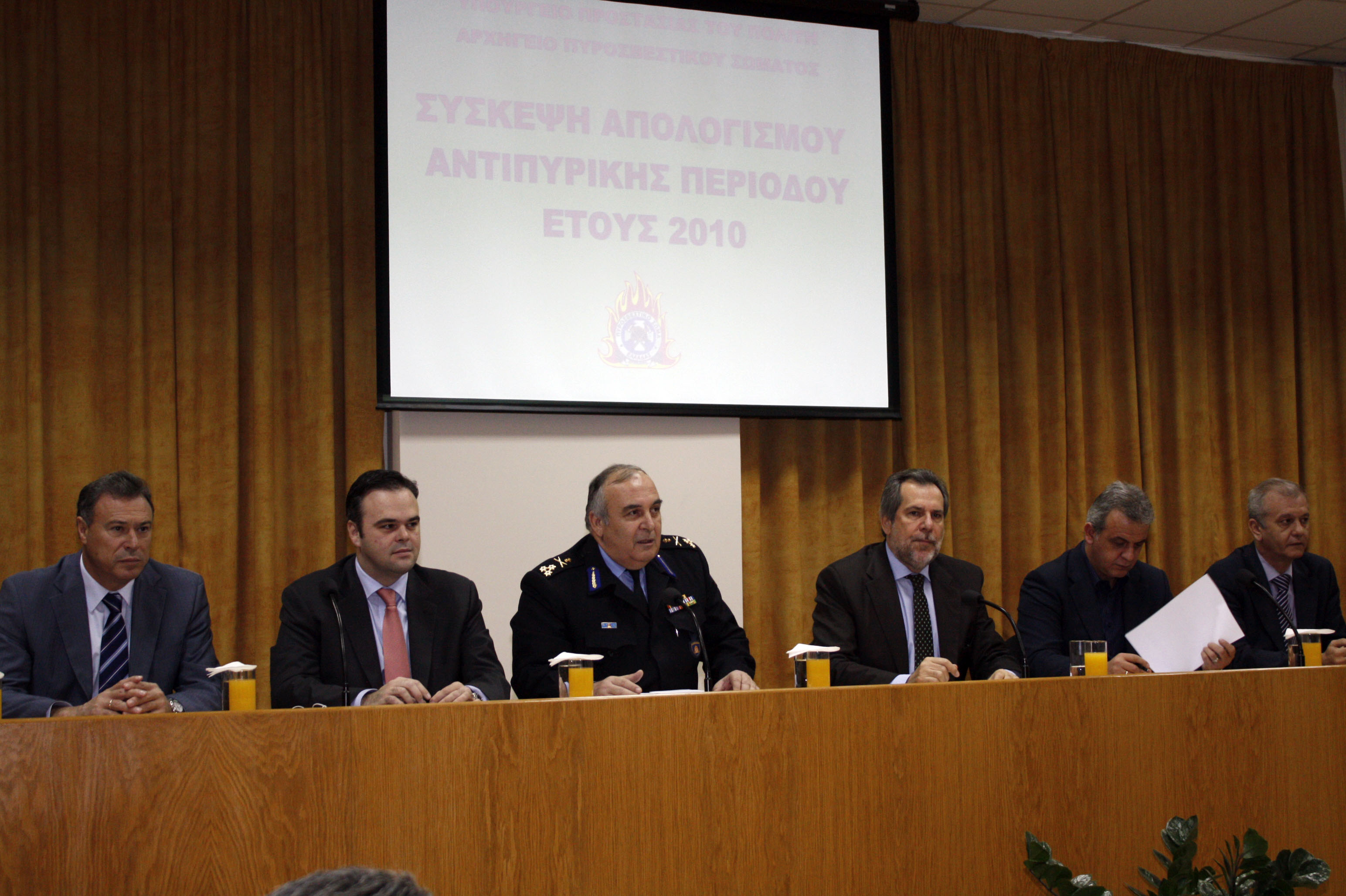 Μετά την ομιλία του κ. Παπουτσή και του κ. Όθωνα, τα αποτελέσματα της αντιπυρικής περιόδου του 2010, παρουσίασε ο Αρχηγός του Π.Σ. Αντιστράτηγος Στυλιανός Στεφανίδης. Τοποθετήσεις έκαναν επίσης ο Γ.Γ.Π.Π. κ. Μπούφης και ο κ. Σγουρός. Με την ολοκλήρωση της παρουσίασης του απολογισμού, ακολούθησε συζήτηση μεταξύ των συμμετεχόντων, για την αποτίμηση του πυροσβεστικού έργου κατά το έτος 2010, ενώ διατυπώθηκαν και προτάσεις για την οργάνωση της επόμενης αντιπυρικής περιόδου.