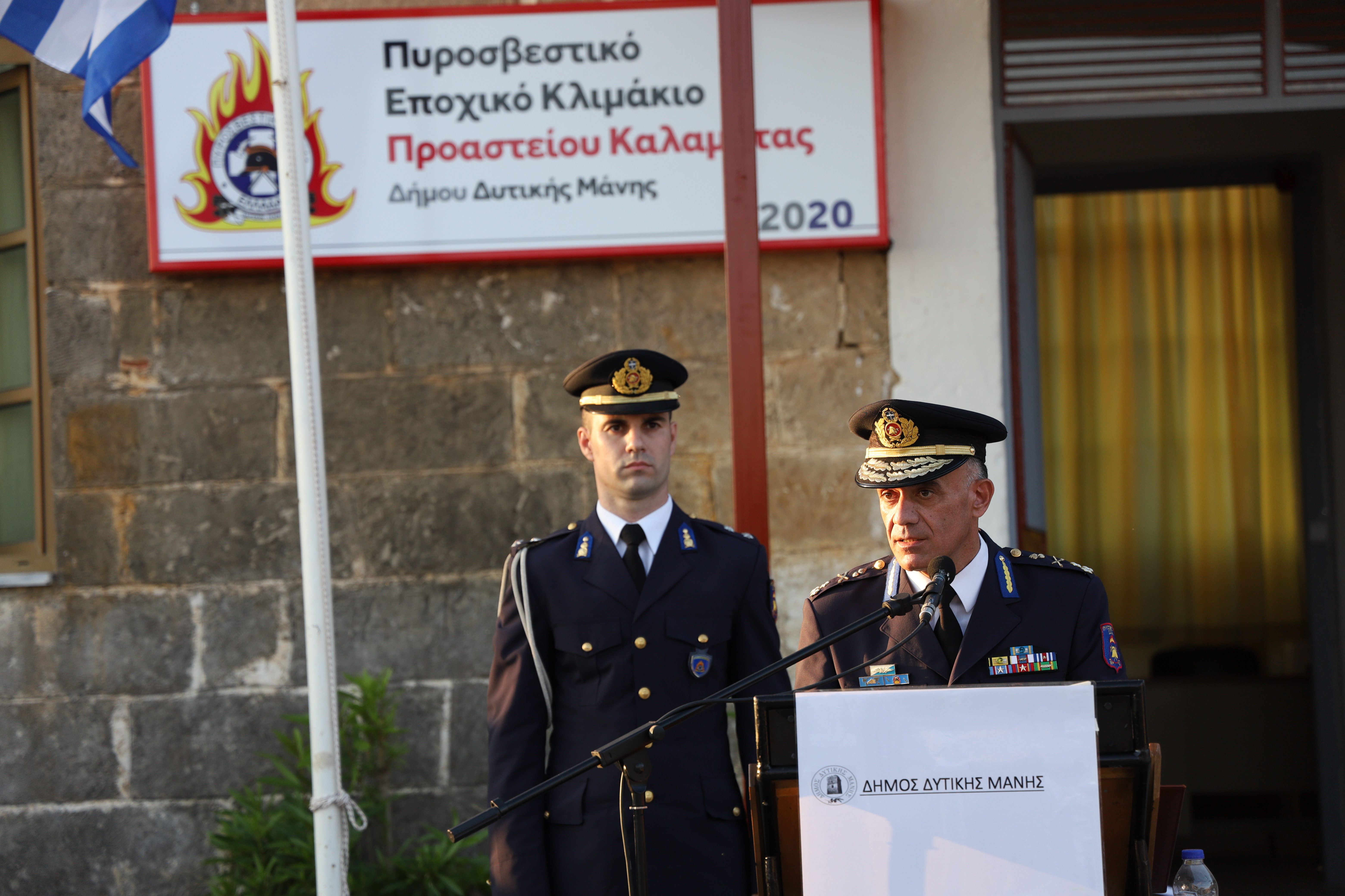 Ο Αρχηγός του Πυροσβεστικού Σώματος Αντιστράτηγος Στέφανος Κολοκούρης μεταφέροντας τους θερμούς χαιρετισμούς του Υφυπουργού Πολιτικής Προστασίας και Διαχείρισης Κρίσεων Νίκου Χαρδαλιά με πρωτοβουλία του οποίου υλοποιήθηκε η ίδρυση ογδόντα (80) Πυροσβεστικών κλιμακίων για την αντιπυρική θωράκιση τη χώρας, ανέφερε ότι, «…άμεση προτεραιότητα και υποχρέωση για μας, είναι πάντα η ζωή του πολίτη, το πολυτιμότερο αγαθό που έχει δοθεί, αλλά και να προφυλάξουμε την περιουσία του, την περιουσία του κράτους, καθώς και το φυσικό περιβάλλον της χώρας μας. Η πολιτεία στο πλαίσιο αυτό, τα τελευταία χρόνια, καταβάλλει ιδιαίτερες προσπάθειες, οργανώνοντας μηχανισμούς για την αντιμετώπιση και τον περιορισμό των καταστροφών, από διάφορα φυσικά και τεχνολογικά φαινόμενα. Το ιδρυθέν εδώ Πυροσβεστικό Κλιμάκιο, αποδεικνύει έμπρακτα το ενδιαφέρον της Πολιτείας και για τον τόπο αυτό! Με τη νέα αυτή υπηρεσία, που θα λειτουργεί σε 24ωρη βάση, διασφαλίζουμε την καλύτερη ποιότητα ζωής των πολιτών, προστατεύουμε τους πολιτιστικούς και φυσικούς πόρους, ενώ συμμετέχουμε ενεργά στη βιώσιμη ανάπτυξη του τόπου. Είναι ξεκάθαρη η αναγκαιότητα του κλιμακίου στο συγκεκριμένο σημείο, καθώς η απόσταση από την κοντινότερη Πυροσβεστική Υπηρεσία, είναι περίπου 40 λεπτά και η διαδρομή πολύ δύσκολη, ειδικά για τα μεγάλα οχήματά μας. Οι προσπάθειες που καταβάλλουμε, δε σκοπεύουν μόνο στην ενίσχυση της πυροπροστασίας και της πολιτικής προστασίας, αλλά αποβλέπουν στην ευημερία, την πρόοδο και την κοινωνική αλληλεγγύη της περιοχής. Επίσης, θα αναβαθμιστεί το επίπεδο προστασίας των ξενοδοχειακών και λοιπών κτιριακών εγκαταστάσεων και θα δημιουργηθεί ένα κλίμα ασφάλειας για τους Έλληνες και ξένους επισκέπτες που φιλοξενούνται στην περιοχή». Στη συνέχεια ο Αρχηγός του Πυροσβεστικού Σώματος ευχαρίστησε θερμά τον Δήμαρχο Δυτικής Μάνης Δημήτρη Γιαννημάρα για την παραχώρηση του οικήματος που πλέον στεγάζετε το νέο πυροσβεστικό κλιμάκιο και τόνισε ότι, «…τέτοιες πράξεις, δεν αποτελούν μόνο ένα παράδειγμα προς μίμηση αλλά αποδεικνύουν ότι όλοι μας μπορούμε να προσφέρουμε για την προκοπή αυτού του τόπου». Ολοκληρώνοντας την ομιλία του ο Αρχηγός του Πυροσβεστικού Σώματος ανέφερε ότι, «…θα ήθελα να σας εγγυηθώ, ότι όλοι οι πυροσβέστες, ένα μόνο σκοπό έχουν, να σας περιφρουρούν από πλήθος κινδύνων και να σας βοηθούν με όλα τα μέσα και την εμπειρία που διαθέτουν. Έχουν αφήσει το Εγώ και λειτουργούν με το Εμείς. Δείξτε τους λοιπόν την εμπιστοσύνη , την αγάπη και τη στήριξή σας, ώστε να έχουν ψυχική δύναμη για να τη δίνουν περίσσεια. Είναι ό,τι πιο πολύτιμο μπορείτε να τους προσφέρετε ως ενθάρρυνση στο δύσκολο και επικίνδυνο έργο που επιτελούν…».