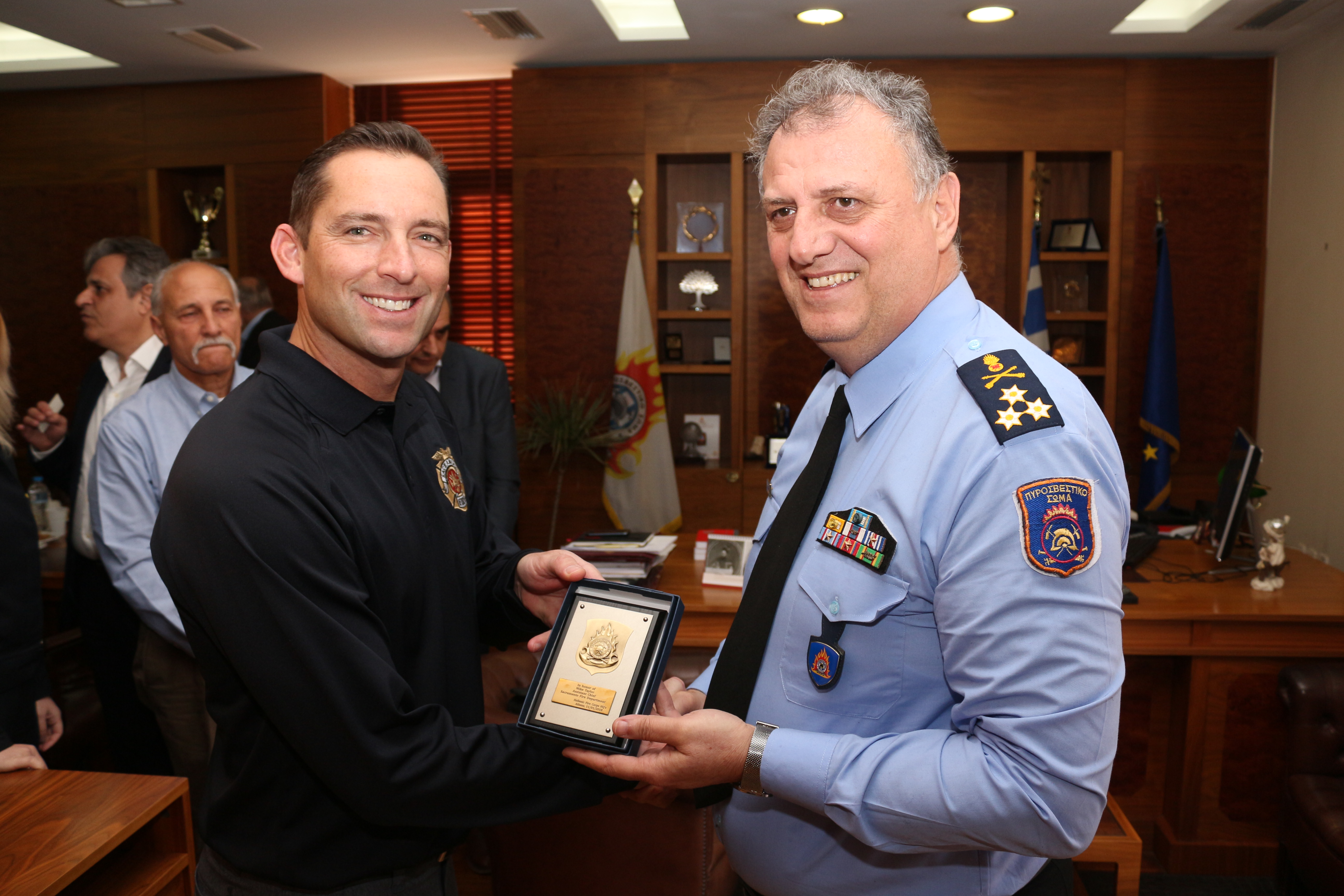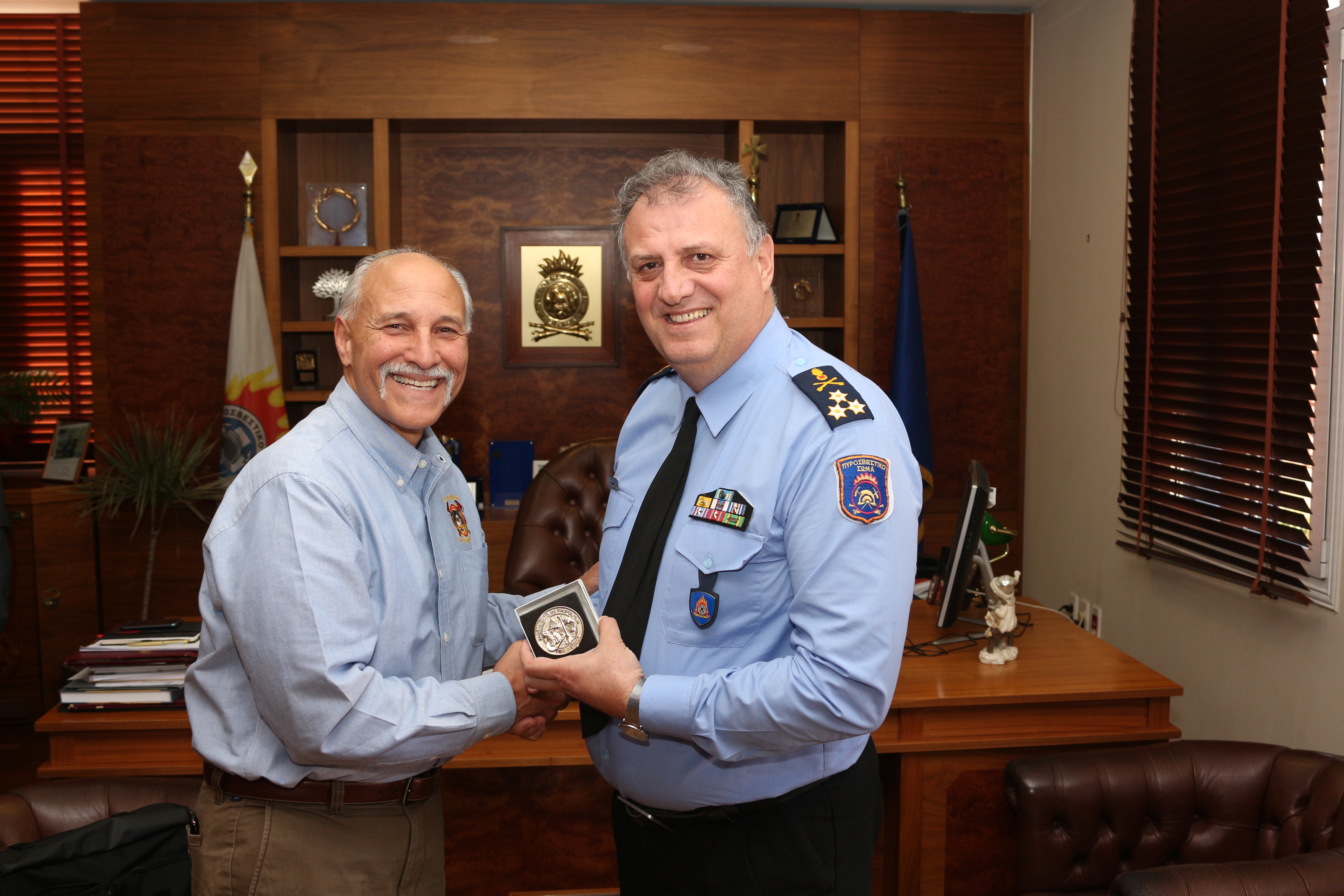 Ο Αρχηγός του Πυροσβεστικού Σώματος, Αντιστράτηγος ΠΣ Βασίλειος Καπέλιος, υποδέχτηκε στο Αρχηγείο του Π.Σ., σήμερα 12 Ιανουαρίου, το κλιμάκιο των τριών Αμερικανών εμπειρογνωμόνων σε θέματα δασοπυρόσβεσης. Η συνάντηση σηματοδοτεί την έναρξη ενός κύκλου επαφών, ώστε να διερευνηθούν οι δυνατότητες συνεργασίας του Ελληνικού Πυροσβεστικού Σώματος με αντίστοιχων αρμοδιοτήτων υπηρεσίες και φορείς των Η.Π.Α.