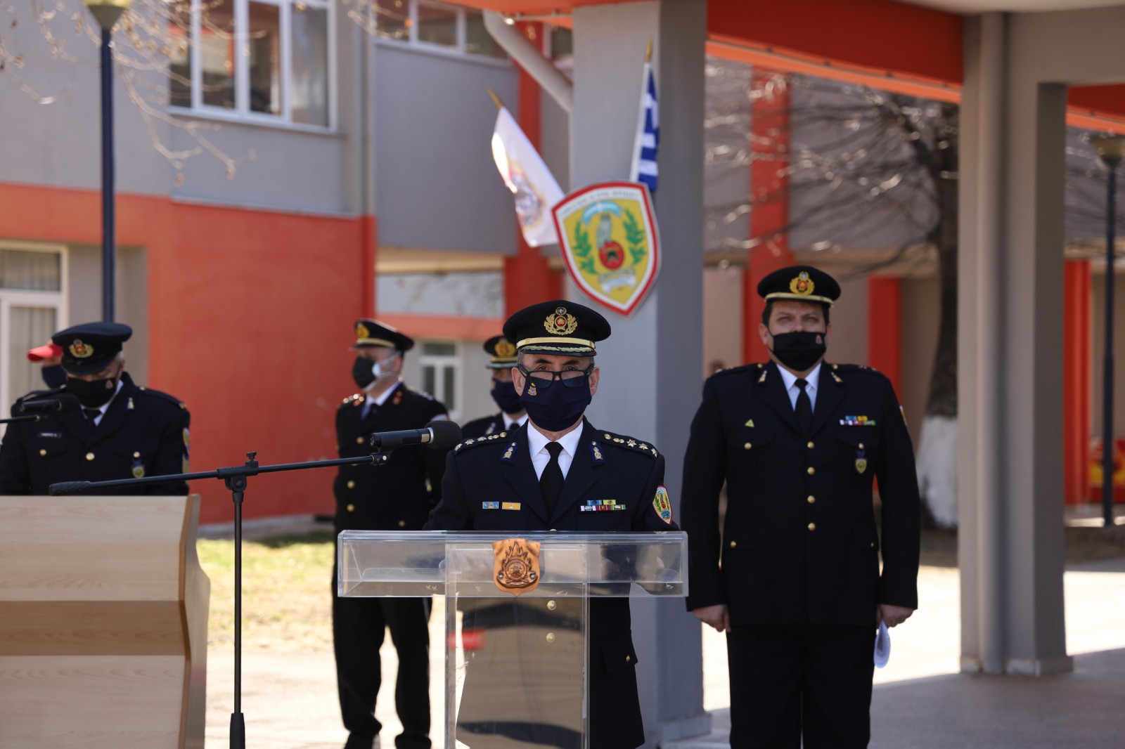 Στη συνέχεια, ο Αρχηγός του Πυροσβεστικού Σώματος, στο σύντομο χαιρετισμό του, μεταξύ άλλων, υπογράμμισε: «... με ιδιαίτερη χαρά, υποδεχόμαστε στη μεγάλη πυροσβεστική οικογένεια, τους νέους Πυροσβέστες και Πυροσβέστριες. Αφού ολοκλήρωσαν την βασική τους εκπαίδευση, από σήμερα, θα ενισχύσουν την ιερή αποστολή του Πυροσβεστικού Σώματος, να προασπίσουν τη ζωή, την περιουσία των συμπολιτών μας, αλλά και τον εθνικό φυσικό πλούτο. Ο όρκος που δώσατε, με τις ευλογίες της Εκκλησίας, την τιμητική παρουσία των εκπροσώπων της Πολιτείας και της Τοπικής Αυτοδιοίκησης, είναι σύμβολο τιμής προς την πατρίδα και το Πυροσβεστικό Σώμα. Επισφραγίζει το τέλος της φοίτησής σας στην Πυροσβεστική Ακαδημία και χαράσσει μια νέα αρχή της επαγγελματικής σας σταδιοδρομίας, ως στελεχών ενός Σώματος που ήταν, είναι και θα είναι καταξιωμένο στη συνείδηση του Ελληνικού λαού. Οι ευθύνες που θα αναλάβετε σε λίγο είναι μεγάλες και το έργο που καλείστε να επιτελέσετε είναι ιδιαίτερα απαιτητικό, επικίνδυνο, σκληρό και δύσκολο, αλλά ταυτόχρονα συναρπαστικό και με μεγάλη κοινωνική προσφορά. Οπλιστείτε με πνευματική και ψυχική δύναμη, καλλιεργήστε μέσα σας το αίσθημα του ανθρωπισμού, τη μετριοπάθεια, τη σεμνότητα, την εντιμότητα, την ακεραιότητα του χαρακτήρα, τη σοβαρότητα, την αξιοπρέπεια και τις άλλες ψυχικές αρετές, γιατί μόνο έτσι θα αποκτήσετε το σεβασμό των υφισταμένων σας, την εμπιστοσύνη των προϊσταμένων σας και την κοινωνική αναγνώριση και καταξίωση. Με τη βεβαιότητα ότι θα φανείτε αντάξιοι των προσδοκιών της πολιτείας και των παραδόσεων του Πυροσβεστικού Σώματος, σας συγχαίρω για την προαγωγή σας και εύχομαι υγεία και καλή επιτυχία στα νέα σας καθήκοντα …».