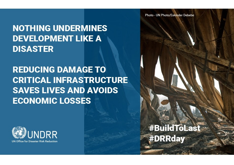 Κάθε χρόνο, η Διεθνής Ημέρα είναι αφιερωμένη σε έναν από τους επτά εμβληματικούς στόχους του Πλαισίου Δράσης Sendai για την Μείωση του Κινδύνου Καταστροφών (Sendai Framework for Disaster Risk Reduction 2015 – 2030). Φέτος οι εορτασμοί της Διεθνούς Ημέρας, αφιερώνονται στη προσπάθεια για την εφαρμογή του Τέταρτου Στόχου του Πλαισίου που σχετίζεται με τη μείωση των ζημιών σε υποδομές ζωτικής σημασίας, καθώς και με την αποτροπή διακοπής παροχής βασικών υπηρεσιών, συμπεριλαμβανομένων των υπηρεσιών υγείας και εκπαίδευσης, συνεπεία καταστροφών.