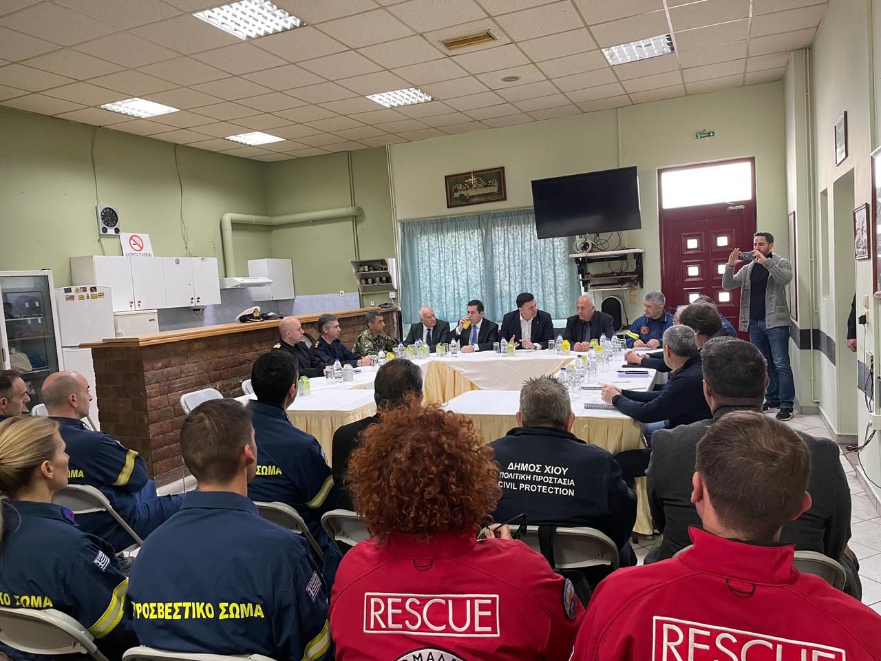 Ευρεία σύσκεψη πραγματοποίησε το πρωί στην Πυροσβεστική Υπηρεσία Χίου ο υπουργός Κλιματικής Κρίσης και Πολιτικής Προστασίας Βασίλης Κικίλιας με τη συμμετοχή του βουλευτή Χίου Νότη Μηταράκη, του Αντιπεριφερειάρχη  Χίου Παντελή Βρουλή, του Δημάρχου Χίου Ιωάννη Μαλάφη, της Διευθύντριας Δασών Χίου Θωμαΐς Κοιλούκου, του Προϊσταμένου Πολιτικής Προστασίας Δήμου Χίου Νικόλαο Βορριά, του Εντεταλμένου Συμβούλου Πολιτικής Προστασίας Δήμου Χίου Γεώργιο Ζώα, του Διευθυντή ΔΕΔΔΗΕ, Γεώργιο Καλαμάκη, του Αντιπλοιάρχου Παντελή Βατούση, του Διοικητή 96 ΑΔΤΕ Χίου Ταξίαρχο Χαράλαμπο Αμπατζίδη, του Αστυνομικού Διευθυντή Χίου Ιωάννη Αραμπατζή, του Διοικητή ΠΕ.ΠΥ.Δ. Βορείου Αιγαίου, Αρχιπύραρχο Παναγιώτη Κυπριωτέλλη, του Διοικητή Π.Υ. Ν. Χίου, Πύραρχο Σταύρο Καπελλαρίδη, του Υποδιοικητή Π.Υ. Χίου, Επιπυραγό Απόστολο Ντίλη.