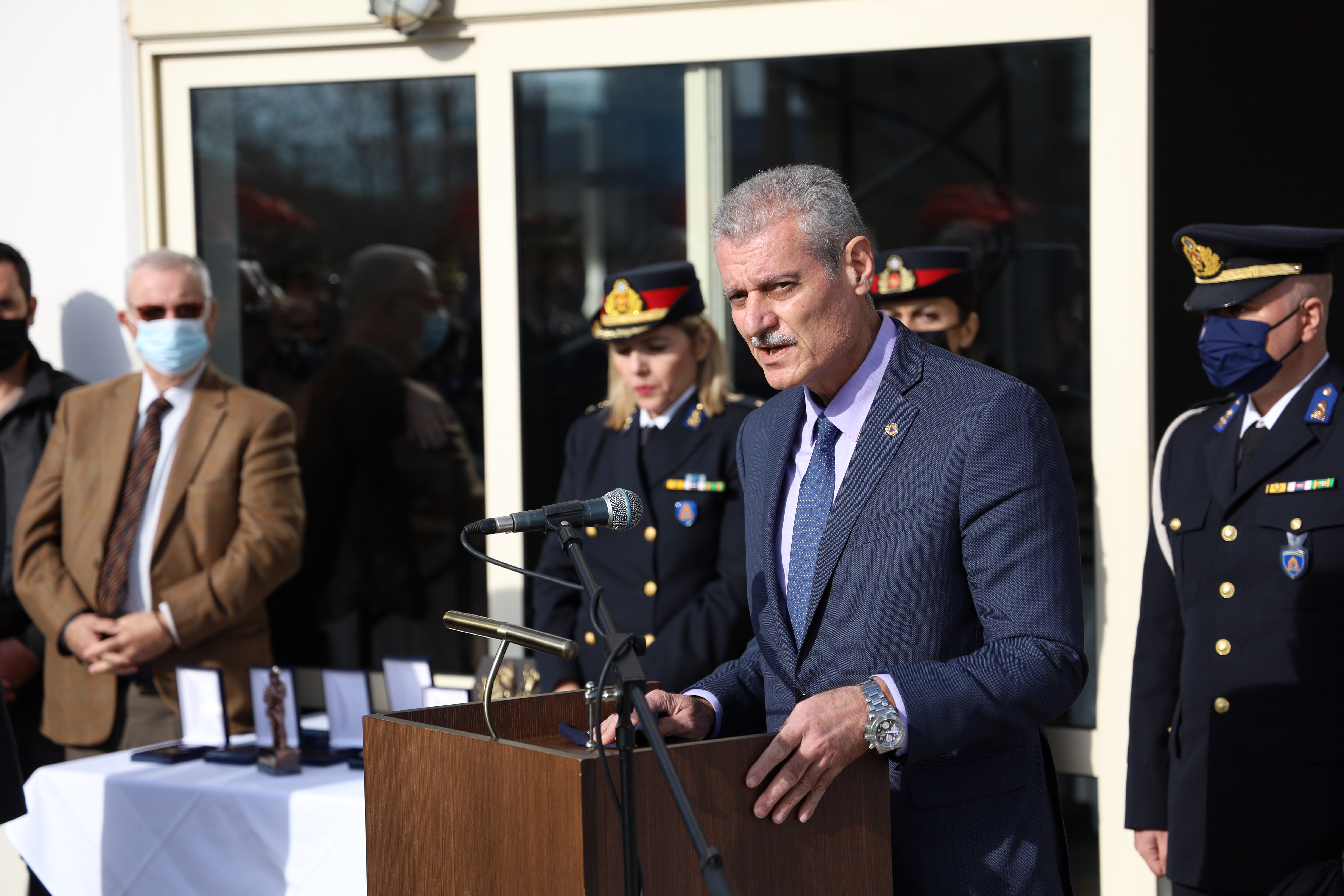 Ο Υφυπουργός Κλιματικής Κρίσης και Πολιτικής Προστασίας Ευάγγελος Τουρνάς, απηύθυνε σύντομο χαιρετισμό τονίζοντας ότι: «…σήμερα είναι μια ξεχωριστή ημέρα μνήμης, τιμούμε και σεβόμαστε το Πυροσβεστικό Σώμα για την προσφορά του και τις θυσίες όλων των στελεχών του που νυχθημερόν βρίσκονται δίπλα στον πολίτη. Με ιδιαίτερη συγκίνηση παρίσταμαι σήμερα εδώ, ελάχιστος φόρος τιμής στη μνήμη του Ανθυποπυραγου Ιωάννη Ζαφειρόπουλου που με πραγματικό ηρωισμό έδωσε τη ζωή του για να σώσει παιδιά που κινδύνευαν, η θυσία του ανυπέρβλητη. Είμαστε δίπλα στο Πυροσβεστικό Σώμα, στις γυναίκες και τους άνδρες του που καθημερινά θέτουν σε κίνδυνο την ίδια τους ζωή για να προστατεύσουν όλους εμάς, για να σώσουν ζωές, περιουσίες και το φυσικό μας πλούτο.