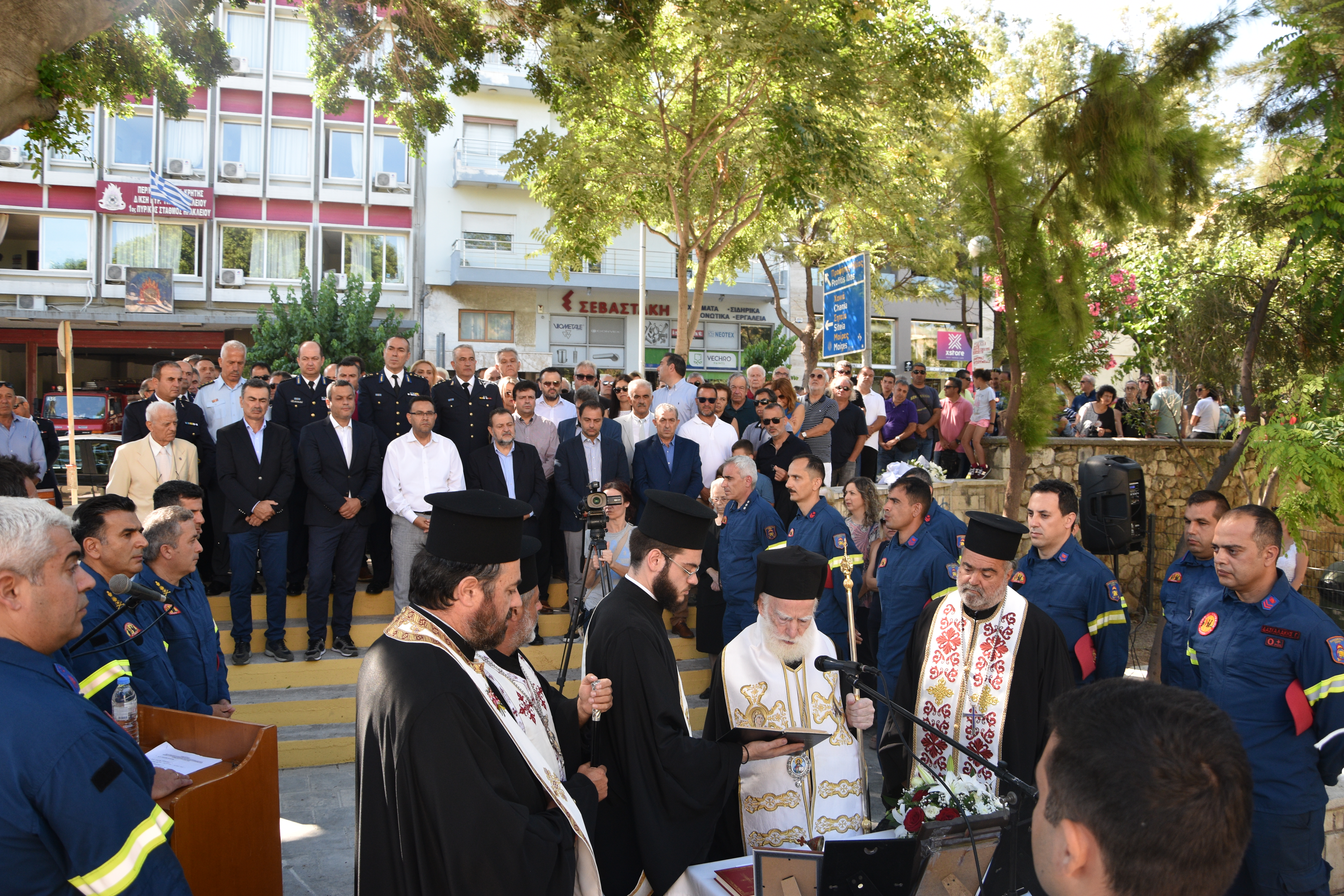 Η επιμνημόσυνη δέηση τελέστηκε προεξάρχοντος του Σεβασμιότατου Αρχιεπισκόπου Κρήτης κ.κ. Ειρηναίου, υπέρ των πυροσβεστών που έχασαν τη ζωή τους κατά την εκτέλεση του καθήκοντος.