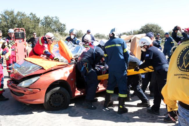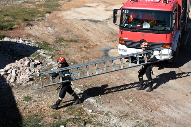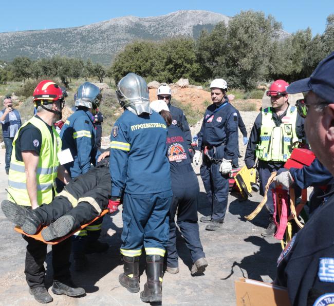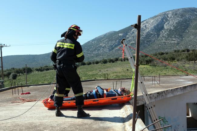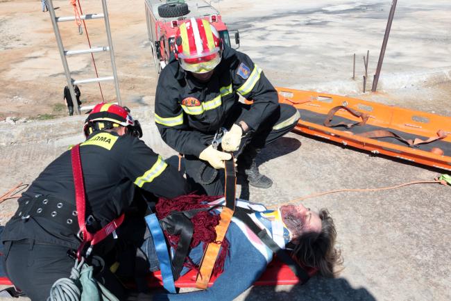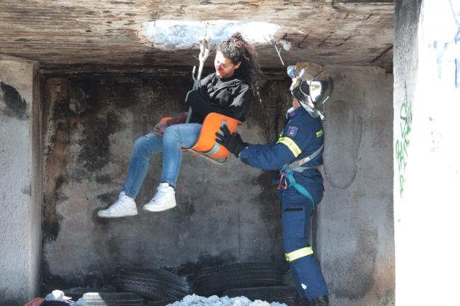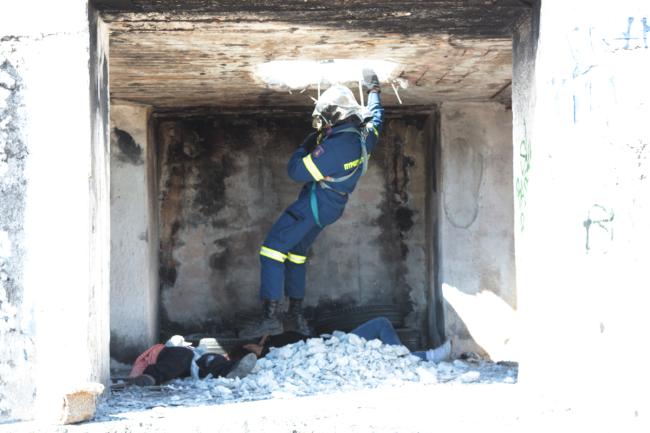 • Το πρώτο σενάριο, αφορούσε τον εγκλωβισμό ενός ατόμου σε διαμέρισμα πρώτου ορόφου, πολυώροφου κτηρίου διαμερισμάτων στο Κορωπί, το οποίο είχε υποστεί μερική κατάρρευση από την εκδήλωση των σεισμικών φαινομένων