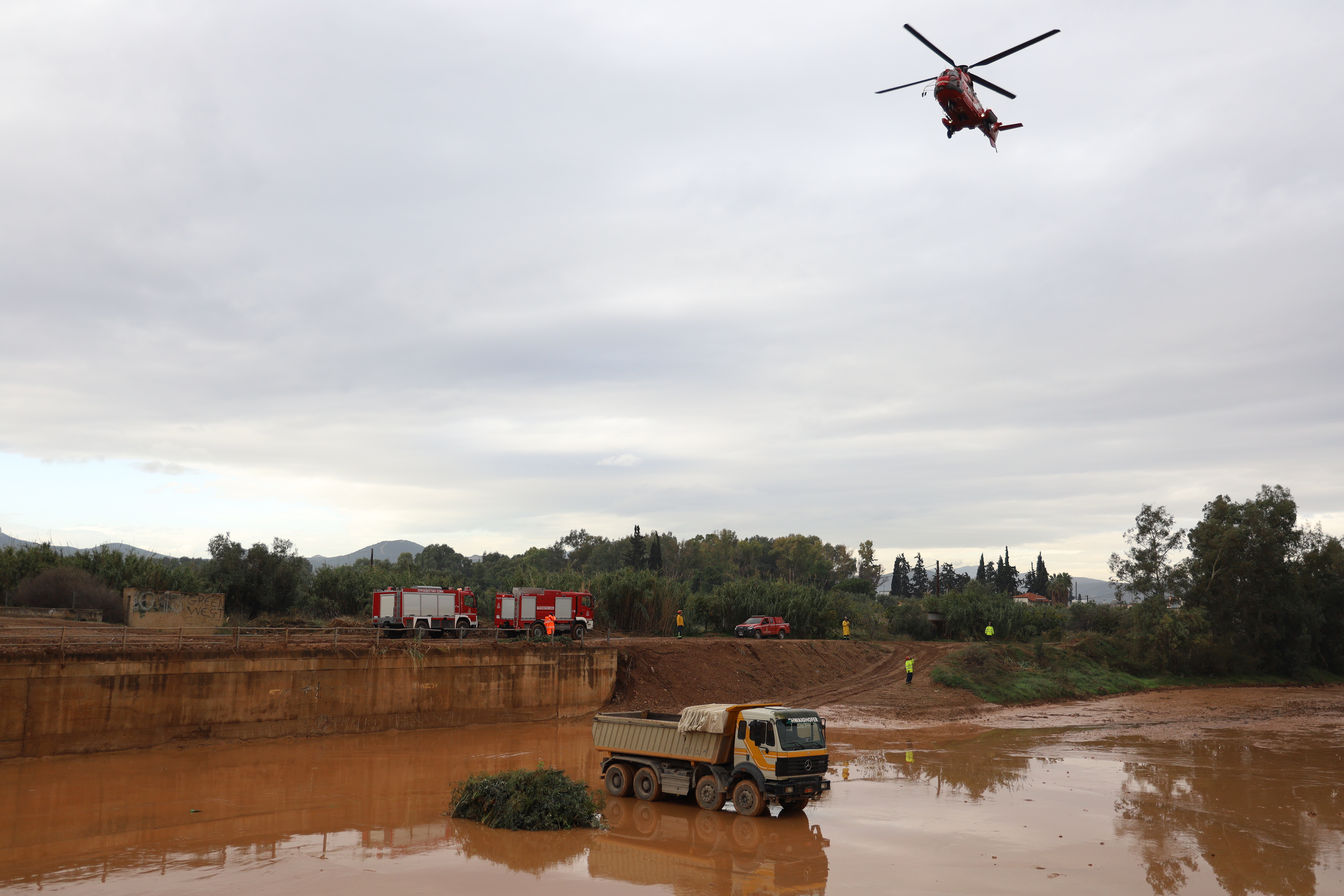 Στις 11:15, φορτηγό όχημα με επιβαίνοντα οδηγό, παρασύρεται από τα ορμητικά νερά και ακινητοποιείται εντός της κοίτης, πλησίον της διασταύρωσης του ανωτέρω ρέματος με τη Ν.Ε.Ο.Α-Κ. Ενεργοποιείται η ομάδα ορμητικών νερών της 1ης ΕΜΑΚ, αλλά η προσέγγιση είναι πολύ δύσκολη και ζητείται η συνδρομή ελικοπτέρου του Πυροσβεστικού Σώματος, το οποίο πραγματοποιεί τη διάσωση του ατόμου.