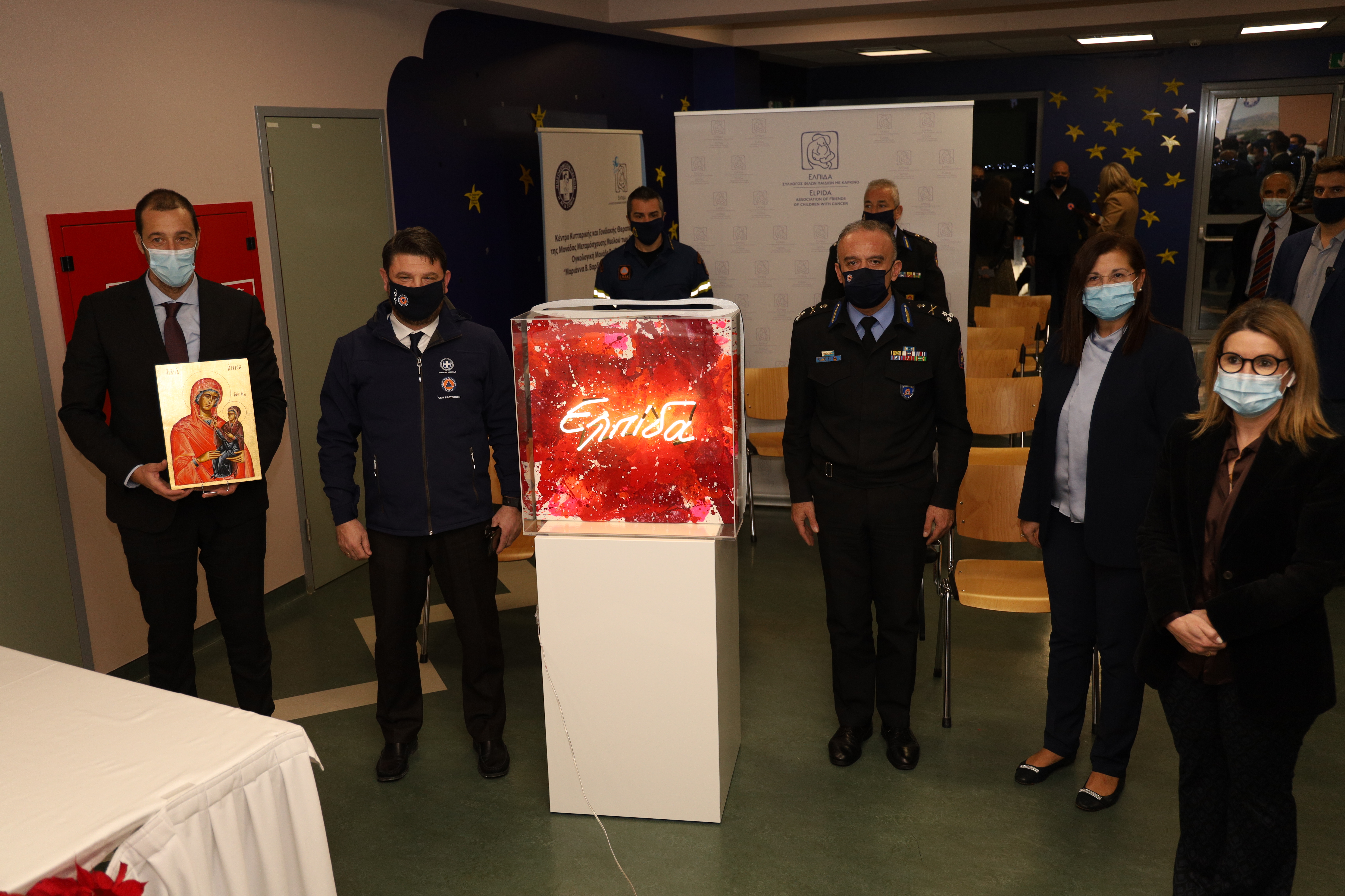 Ο Αρχηγός του Πυροσβεστικού Σώματος Αντιστράτηγος Στέφανος Κολοκούρης μεταξύ άλλων ανέφερε ότι «… οι συνθήκες που πραγματοποιείται αυτή η εκδήλωση είναι πολύ δύσκολες, λόγω της πανδημίας, όμως όταν όλοι μαζί δίνουμε τον καλύτερο εαυτό μας το αποτέλεσμα μας δικαιώνει και ο στόχος επιτυγχάνεται. Συγκεντρωθήκαμε στο χώρο αυτό για να σκορπίσουμε γέλια και χαρά στα παιδιά που φιλοξενούνται και να τα γεμίσουμε με την αισιοδοξία, που άλλωστε είναι και το νόημα των Χριστουγέννων». Στη συνέχεια, αφού ο Αρχηγός του Πυροσβεστικού Σώματος, ευχήθηκε προσωπικά στην κυρία Μαριάννα Β. Βαρδινογιάννη και στο προσωπικό του ιδρύματος να συνεχίσουν να επιτελούν το έργο τους με τον ίδιο ζήλο, μοιράζοντας χαρά και ελπίδα τόσο στα μικρά παιδιά όσο και στις οικογένειές τους, προσέφερε ένα έργο τέχνης, μια φωτιζόμενη παρουσίαση της λέξης ΕΛΠΙΔΑ που αντικατοπτρίζει την ελπίδα και φωτίζει τις ψυχές των παιδιών.