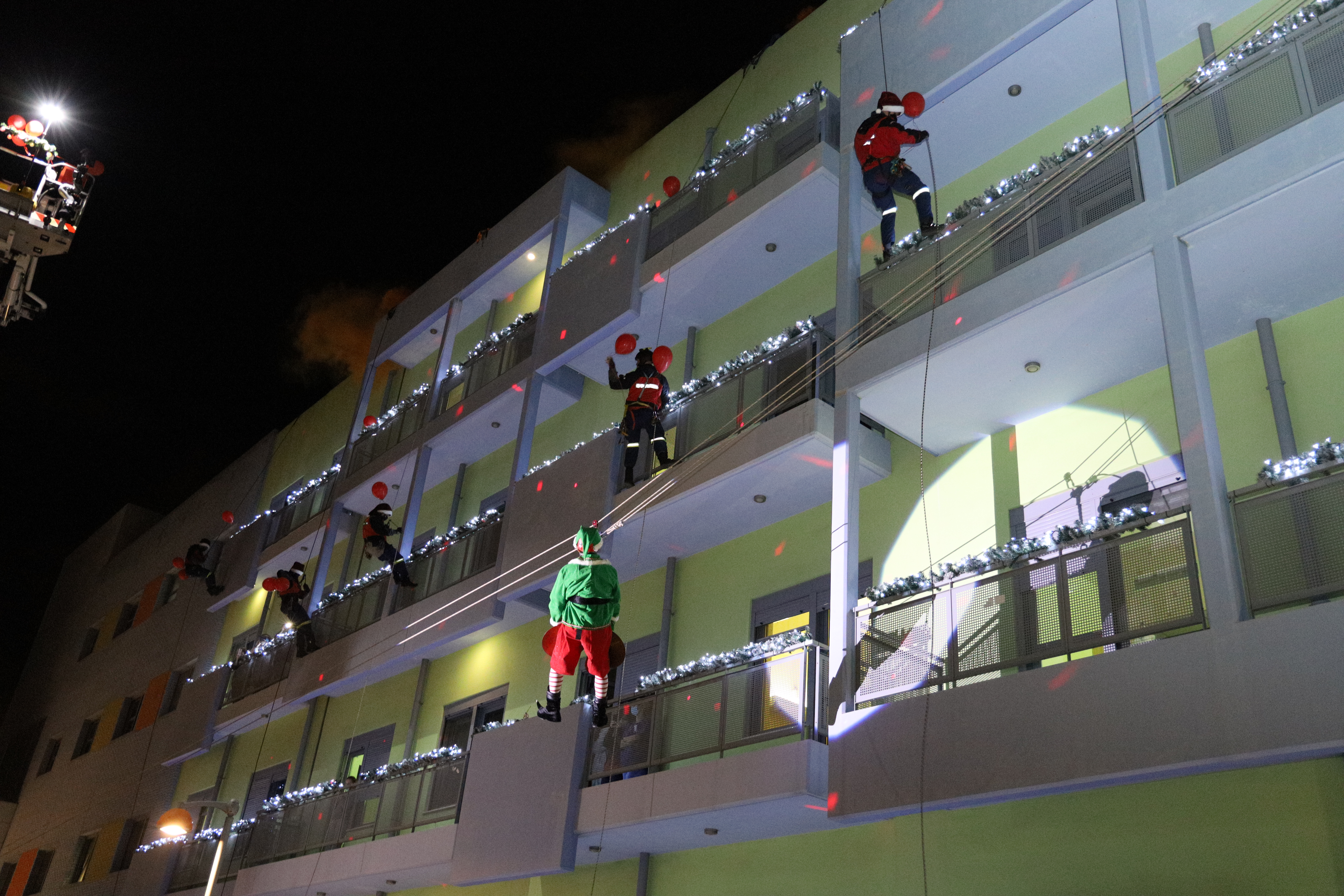 Κατά την εξέλιξη της εκδήλωσης, τα παιδιά είχαν την ευκαιρία να δουν από κοντά τους πυροσβέστες να πραγματοποιούν επίδειξη πυροσβεστικών επιχειρήσεων, καθώς η μπάντα του Πυροσβεστικού Σώματος παιάνιζε χριστουγεννιάτικες μελωδίες. Ο Άγιος Βασίλης και οι καλικάντζαροι μοίρασαν δώρα στο προαύλιο του νοσοκομείου και ιπτάμενοι πυροσβέστες κατέβαιναν με σχοινιά από όροφο σε όροφο, χαρίζοντας δώρα. Τα παιδιά χάρηκαν και εξέφρασαν τον ενθουσιασμό τους, με το δικό τους μοναδικό τρόπο.