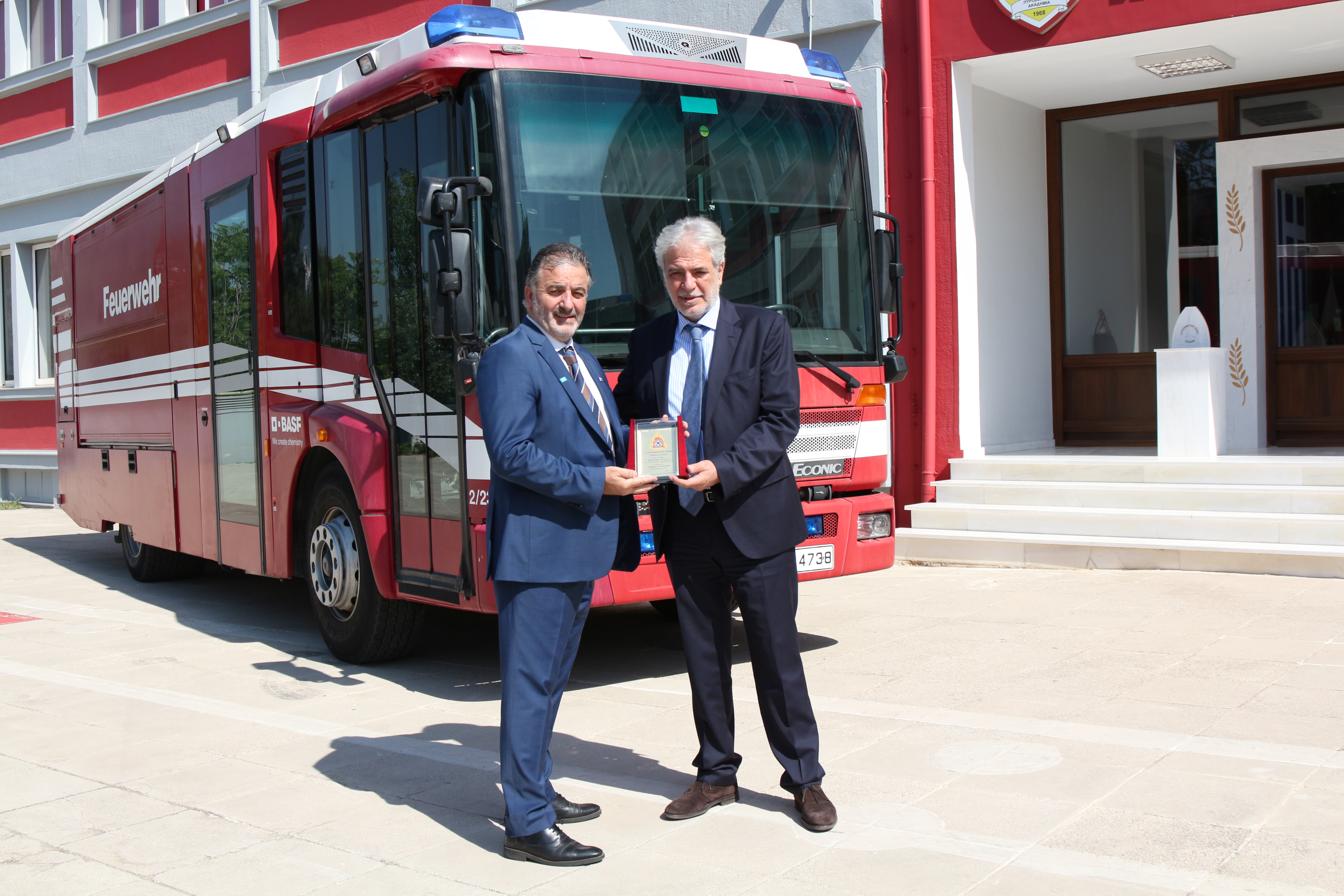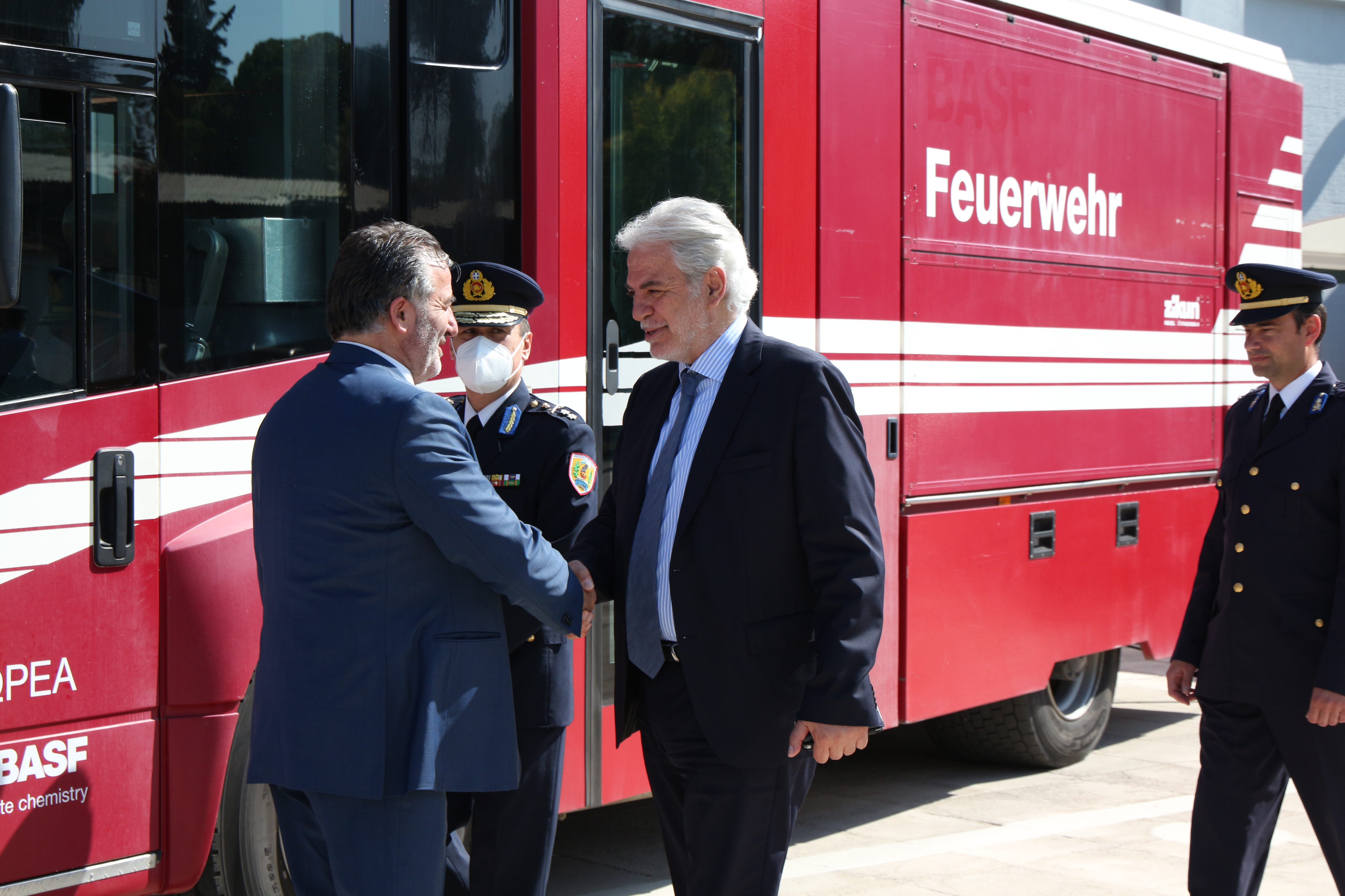 Παρουσία του Υπουργού Κλιματικής Κρίσης και Πολιτικής Προστασίας Χρήστου Στυλιανίδη και του Υπαρχηγού ΠΣ Αντιστράτηγου Ιωάννη Πετρούτσου, ο οποίος εκπροσώπησε τον Αρχηγό ΠΣ Αντιστράτηγο Αλέξιο Ράπανο, η εταιρία «BASF ΕΛΛΑΣ Α.Β.Ε.Ε.» προχώρησε στη δωρεά δύο (2) υδροφόρων πυροσβεστικών οχημάτων, μετά του εξοπλισμού τους, για τις επιχειρησιακές ανάγκες του Πυροσβεστικού Σώματος, σε μία λιτή τελετή που πραγματοποιήθηκε σήμερα στις εγκαταστάσεις της Πυροσβεστικής Ακαδημίας, στην Κ. Κηφισιά.