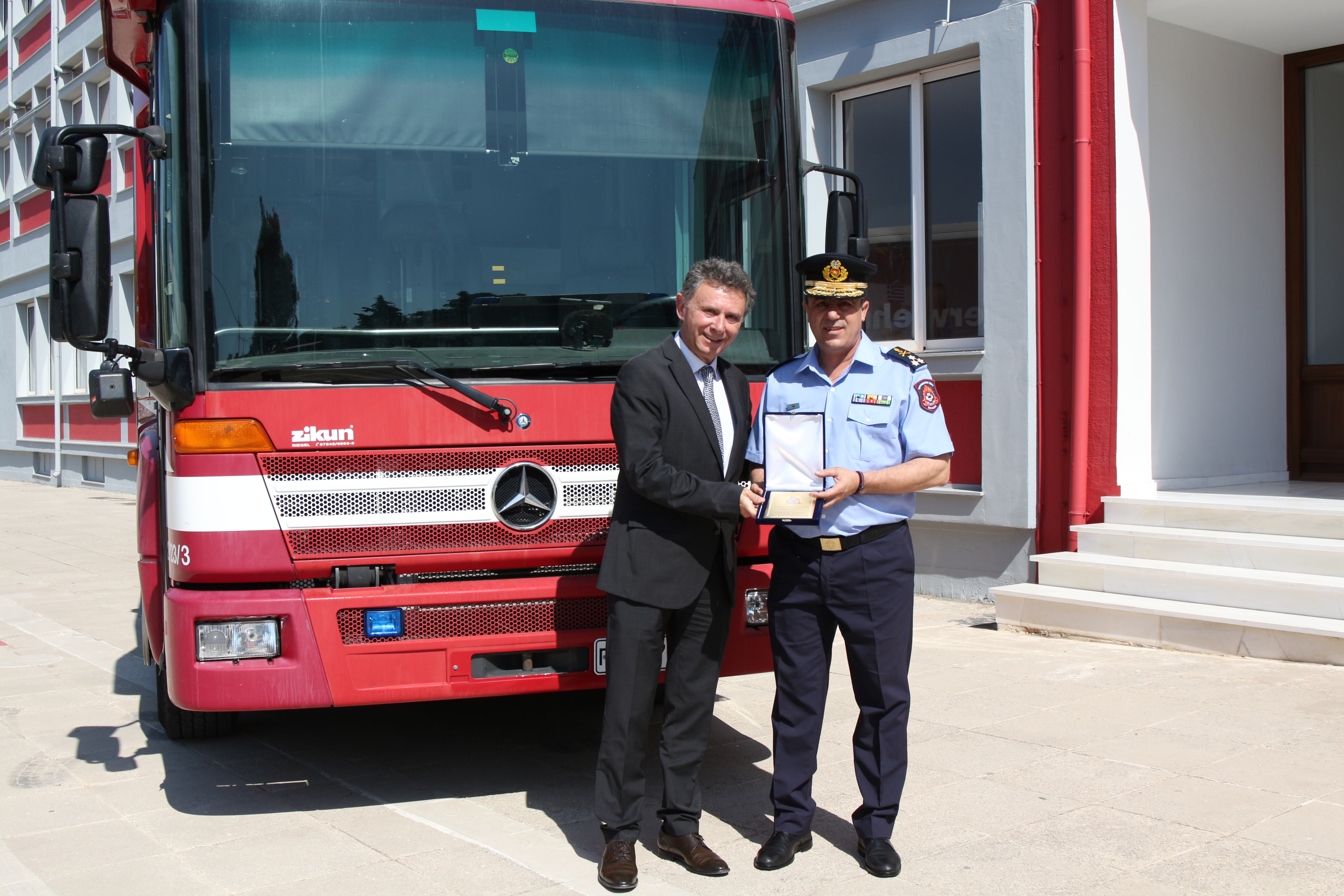 Είναι ιδιαίτερα ενθαρρυντικό να έχουμε σήμερα στο πλευρό μας ανθρώπους, που είναι έτοιμοι να βοηθήσουν. Ο Έλληνας πολίτης τρέφει μεγάλη ευγνωμοσύνη προς τους χορηγούς. Είναι μία, θα έλεγα, πανάρχαια συνήθεια σε αυτόν τον τόπο. Παραλαμβάνουμε, λοιπόν, σήμερα δύο πολύ χρήσιμα οχήματα, που θα βοηθήσουν σημαντικά στο έργο των ηρωικών Πυροσβεστών μας.