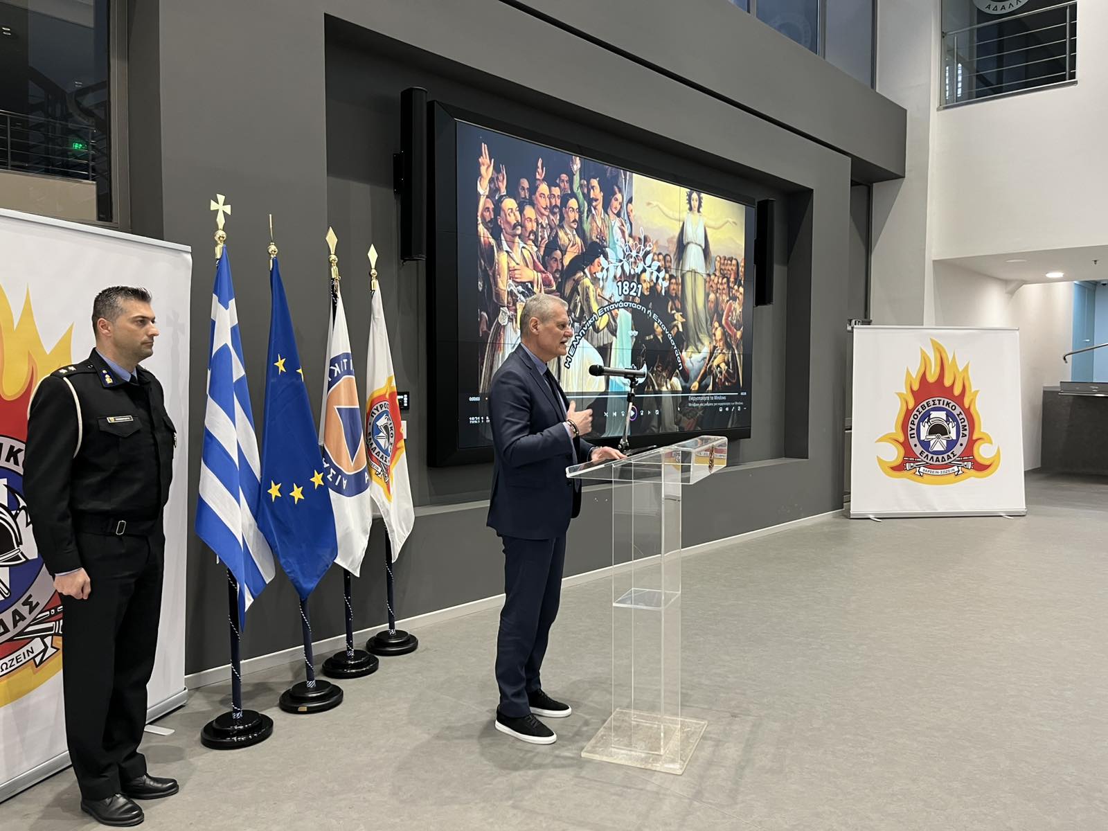Παρουσία των Υφυπουργών Κλιματικής Κρίσης και Πολιτικής Προστασίας Ευάγγελου Τουρνά και Κωνσταντίνου Κατσαφάδου, του Γενικού Γραμματέα Αποκατάστασης Φυσικών Καταστροφών και Κρατικής Αρωγής Πέτρου Καμπούρη, καθώς και του Αρχηγού Πυροσβεστικού Σώματος Αντιστράτηγου Θεόδωρου Βάγια, πραγματοποιήθηκε σήμερα, στις εγκαταστάσεις του Υπουργείου Κλιματικής Κρίσης και Πολιτικής Προστασίας, στο Μαρούσι, η κεντρική εκδήλωση για τον εορτασμό της Εθνικής Επετείου της 25ης Μαρτίου 1821.