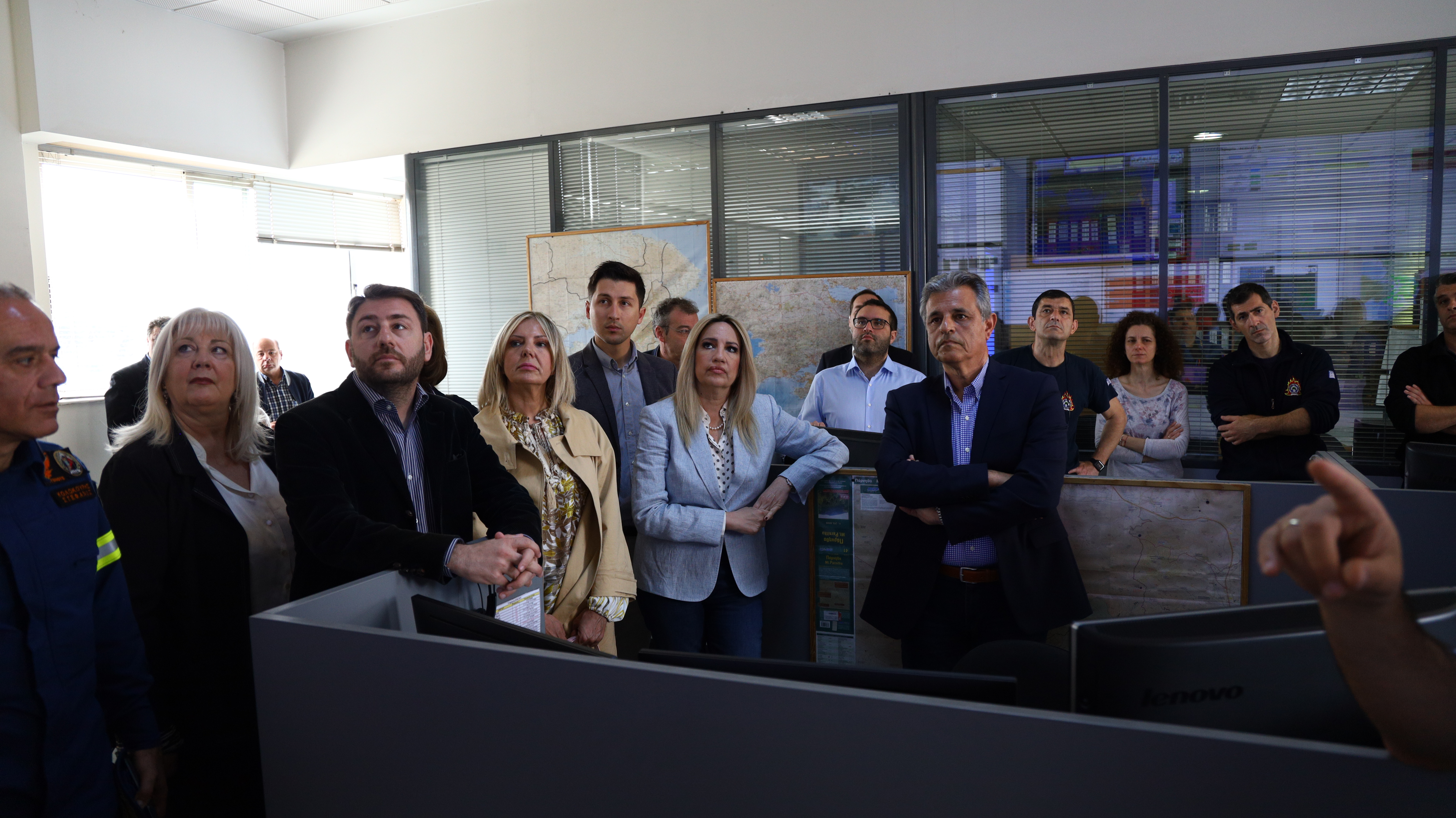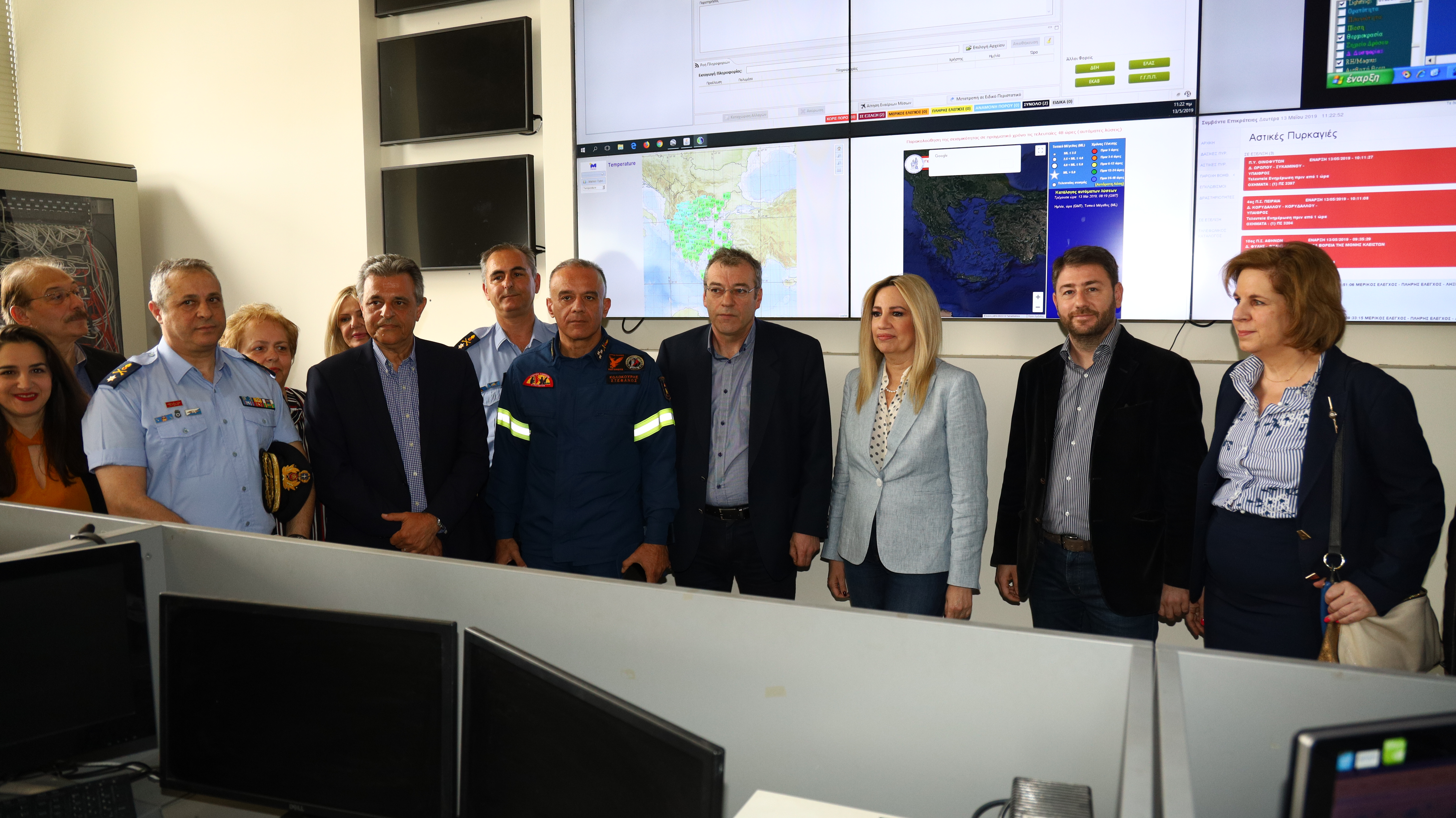 Η Πρόεδρος του Κινήματος Αλλαγής (ΚΙΝ.ΑΛ.) Φώφη Γεννηματά, επισκέφθηκε σήμερα, Δευτέρα 13 Μαΐου 2019, το Ενιαίο Συντονιστικό Κέντρο Επιχειρήσεων (Ε.Σ.Κ.Ε.) του Πυροσβεστικού Σώματος στο Χαλάνδρι, όπου την υποδέχθηκαν ο Γενικός Γραμματέας Πολιτικής Προστασίας, Γιάννης Ταφύλλης και ο Αρχηγός του Πυροσβεστικού Σώματος, Αντιστράτηγος ΠΣ Βασίλειος Ματθαιόπουλος.