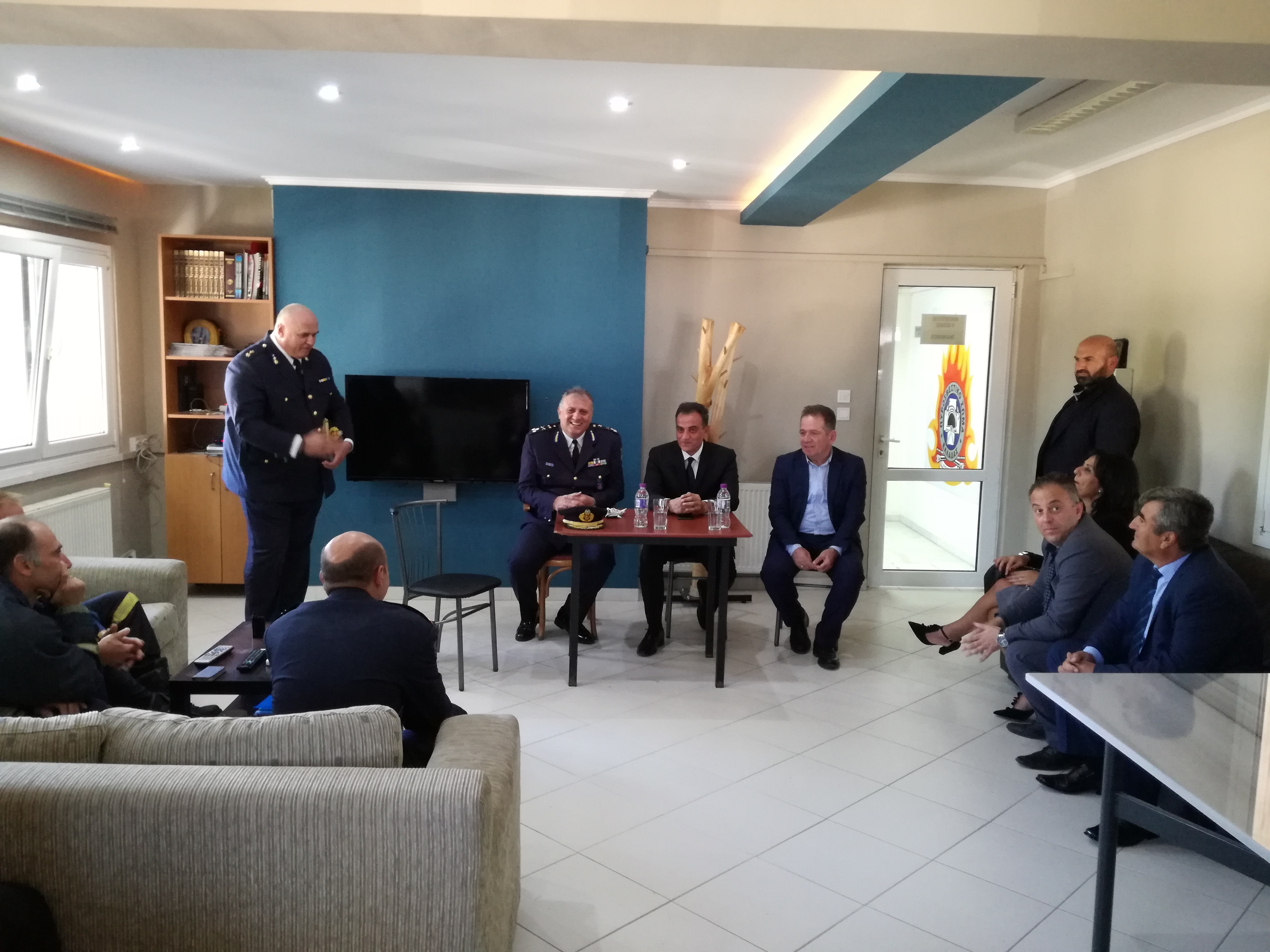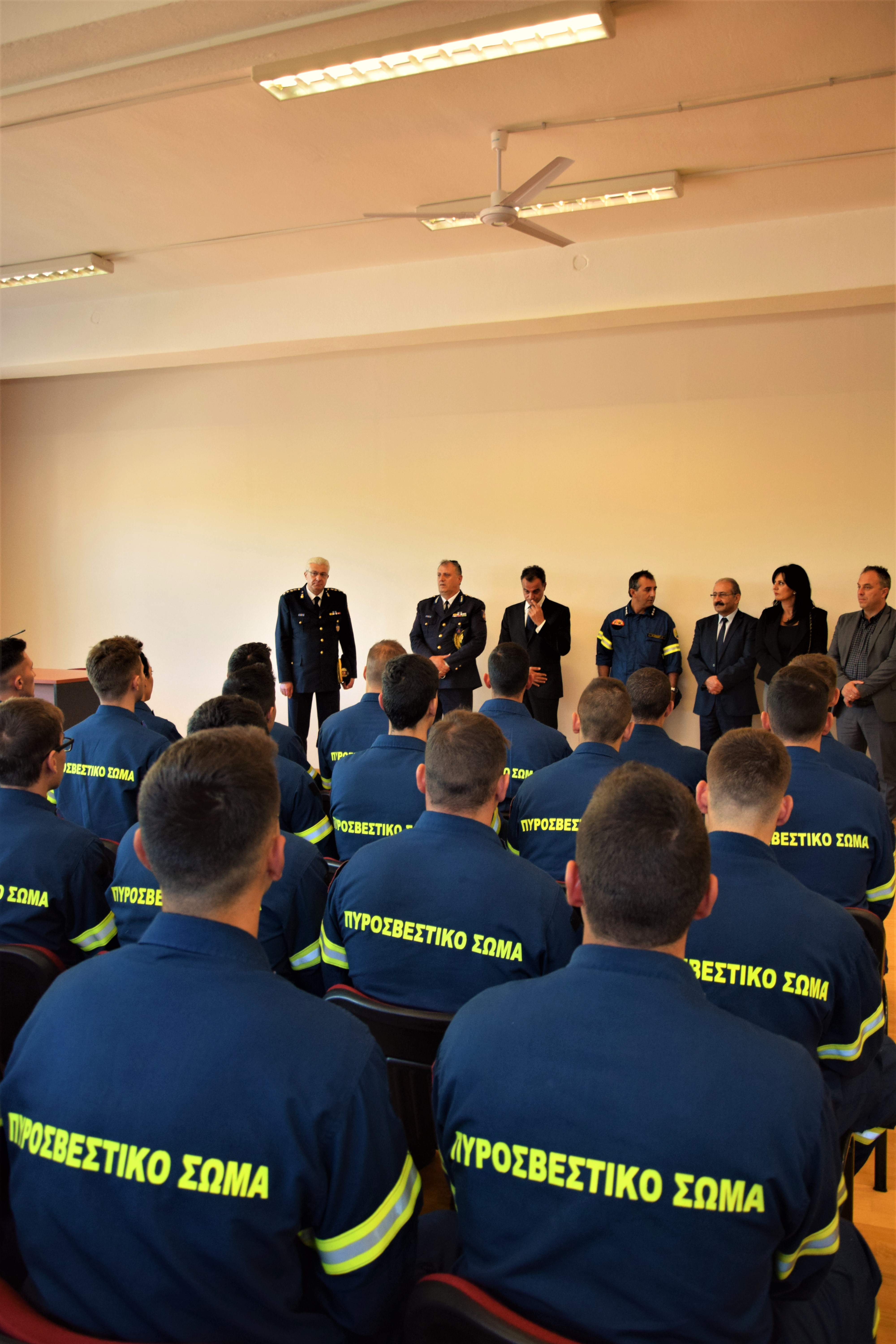 Μετά τη σύσκεψη οι παραβρισκόμενοι απεύθυναν ένα σύντομο χαιρετισμό στους Δόκιμους Πυροσβέστες και το προσωπικό της Σχολής και συνομίλησαν μαζί τους.