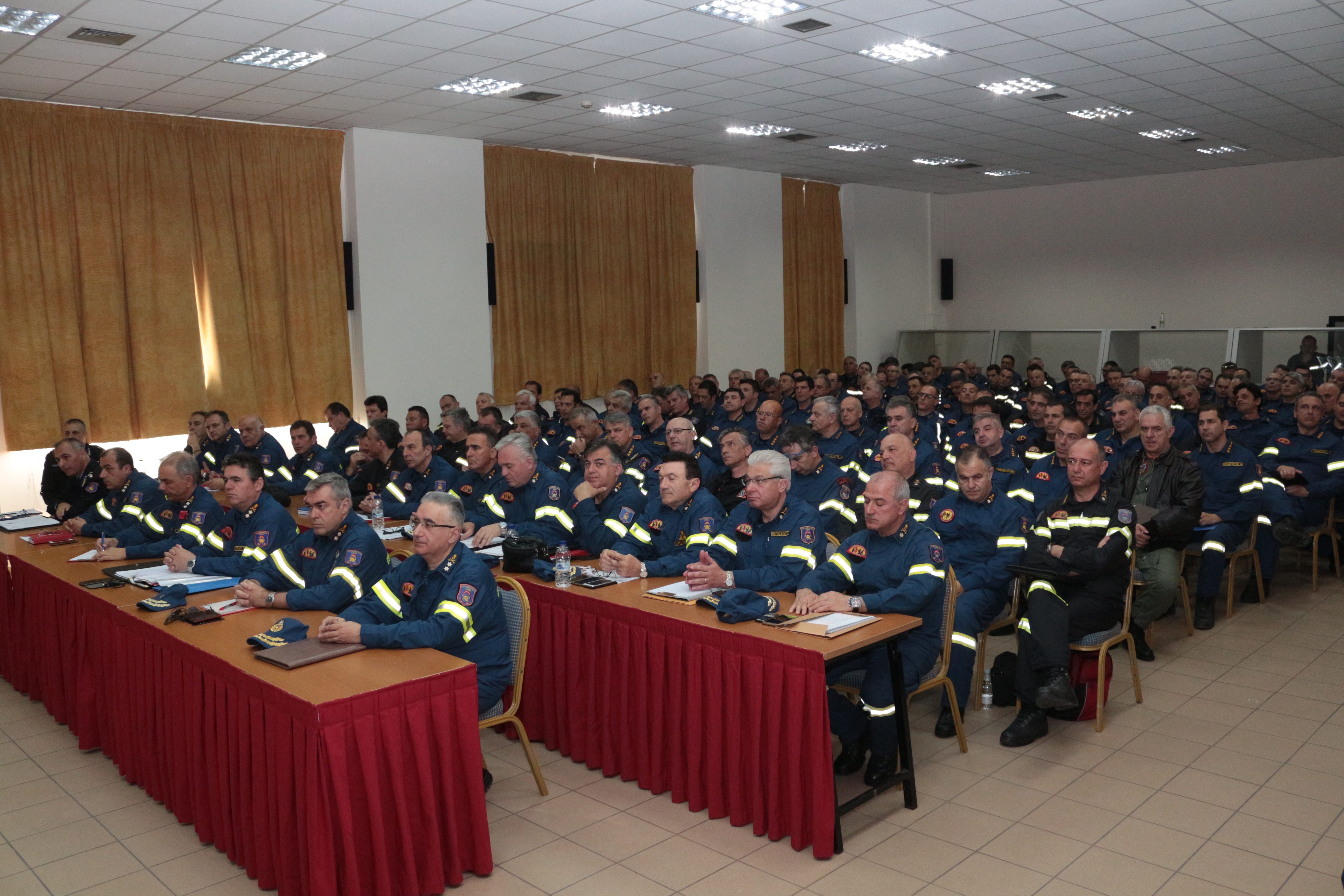 Στη σύσκεψη συμμετείχαν: ο Υπαρχηγός Επιχειρήσεων Αντιστράτηγος ΠΣ Στέφανος Κολοκούρης, ο Υπαρχηγός Υποστήριξης Αντιστράτηγος ΠΣ Κωνσταντίνος Κυριακόπουλος, ο Συντονιστής Υποστήριξης Υποστράτηγος ΠΣ Αναστάσιος Σωτήρχος, οι Συντονιστές Επιχειρήσεων Υποστράτηγοι ΠΣ Αχιλλέας Τζουβάρας, Σπυρίδων Βαρσάμης και Ιωάννης Πετρούτσος, ο Διοικητής Ε.Σ.Κ.Ε. Υποστράτηγος ΠΣ Ιάκωβος Κλεφτοσπύρος, ο Διοικητής της ΠΕ.ΠΥ.Δ. Αττικής Υποστράτηγος ΠΣ Νικόλαος Σπαής, οι Διοικητές των Περιφερειακών Πυροσβεστικών Διοικήσεων, οι Διευθυντές του 199 Σ.Ε.Κ.Υ.Π.Σ. - Κ.Ε.Π.Π., οι Διοικητές των Πυροσβεστικών Υπηρεσιών Αθηνών, Πειραιώς, Ανατολικής και Δυτικής Αττικής, της 1ης Ε.Μ.Α.Κ. οι Διευθυντές Διευθύνσεων του Α.Π.Σ., ο Διοικητής της Υ.Ε.Μ.Π.Σ., ο Διοικητής της Σχολής Ανθυποπυραγών της Πυροσβεστικής Ακαδημίας, ο Διευθυντής της Δ.Α.Ε.Ε., οι Διοικητές Πυροσβεστικών Σταθμών Αττικής και λοιπών Πυροσβεστικών Υπηρεσιών της Επικράτειας.