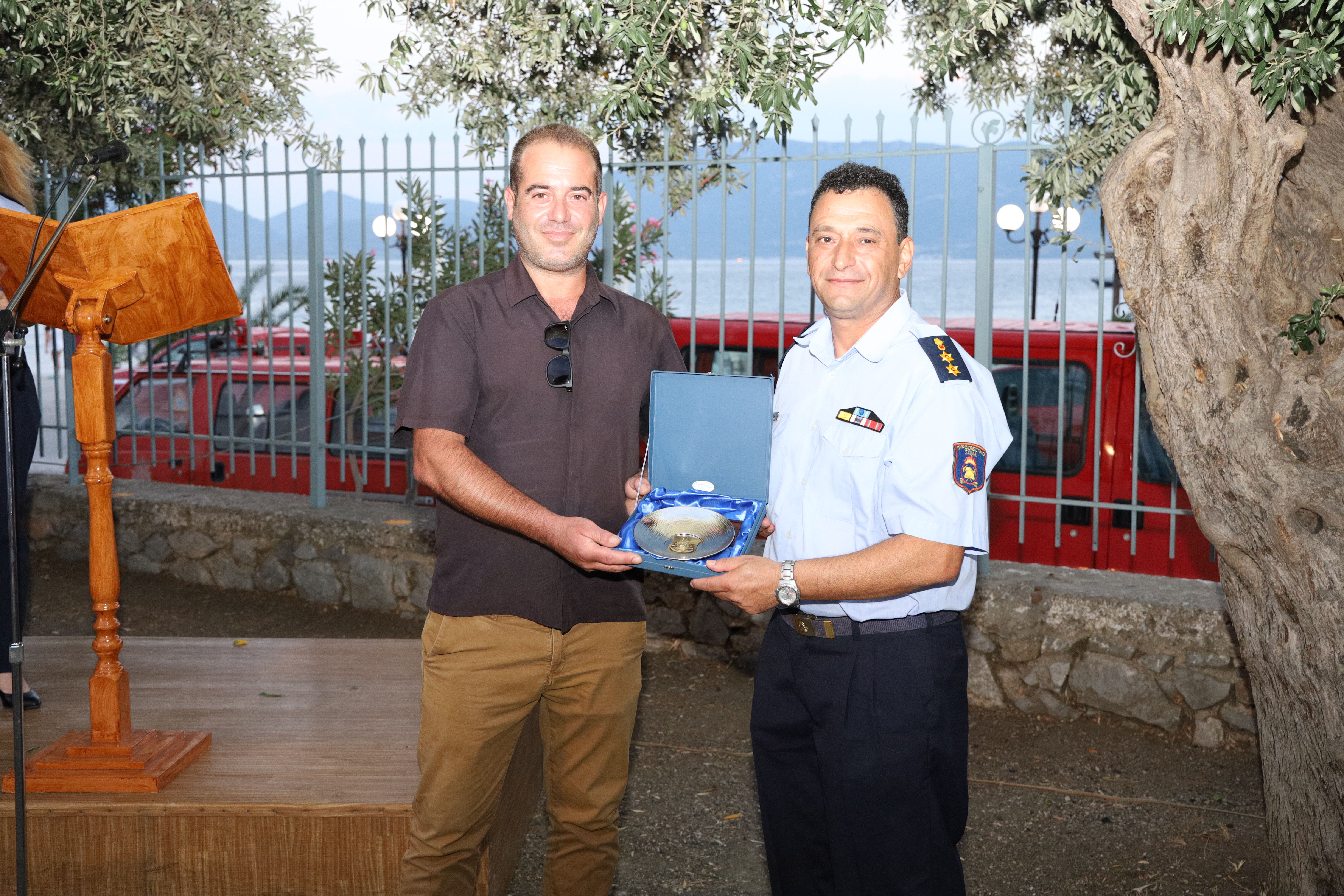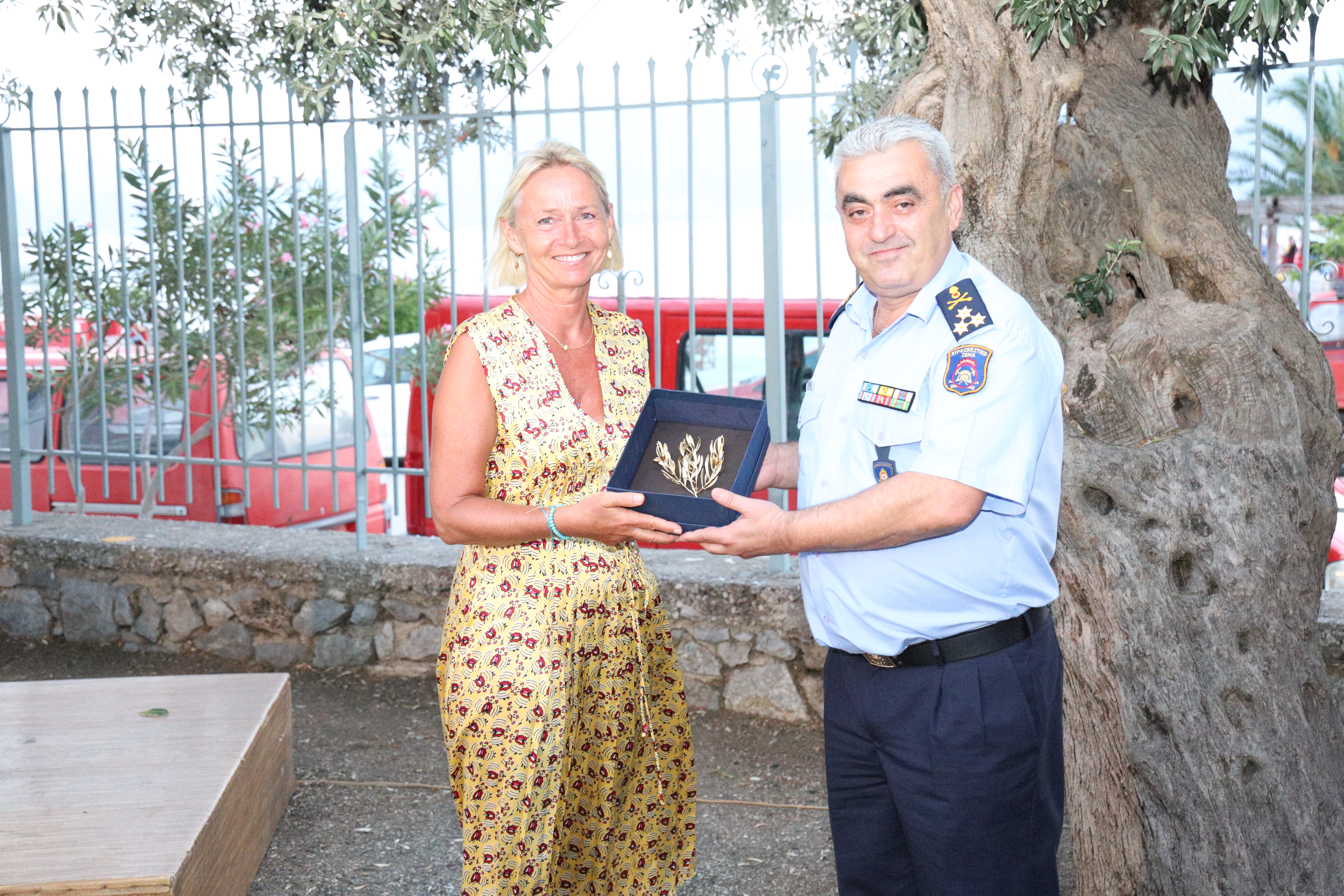 Μετά το πέρας της τελετής, επιδόθηκαν τιμητικά αναμνηστικές πλακέτες από τον Επιτελάρχη του Αρχηγείου Π.Σ. Αντιστράτηγο Αλέξιο Ράπανο προς την κυρία Françoise Dumont, από τον Διοικητή Πυροσβεστικών Υπηρεσιών Ευβοίας Πύραρχο Σίμο Αποστόλου προς τον Δήμαρχο Ιστιαίας-Αιδηψού Ιωάννη Κοντζιά και από τον Διοικητή Π.Υ. Ιστιαίας Αντιπύραρχο Κων/νο Ψαρρό προς τον κ. Ιωάννη Αδαμάκη μέλος του Τοπικού Συμβουλίου της Δ.Ε. Λιχάδας Ευβοίας.