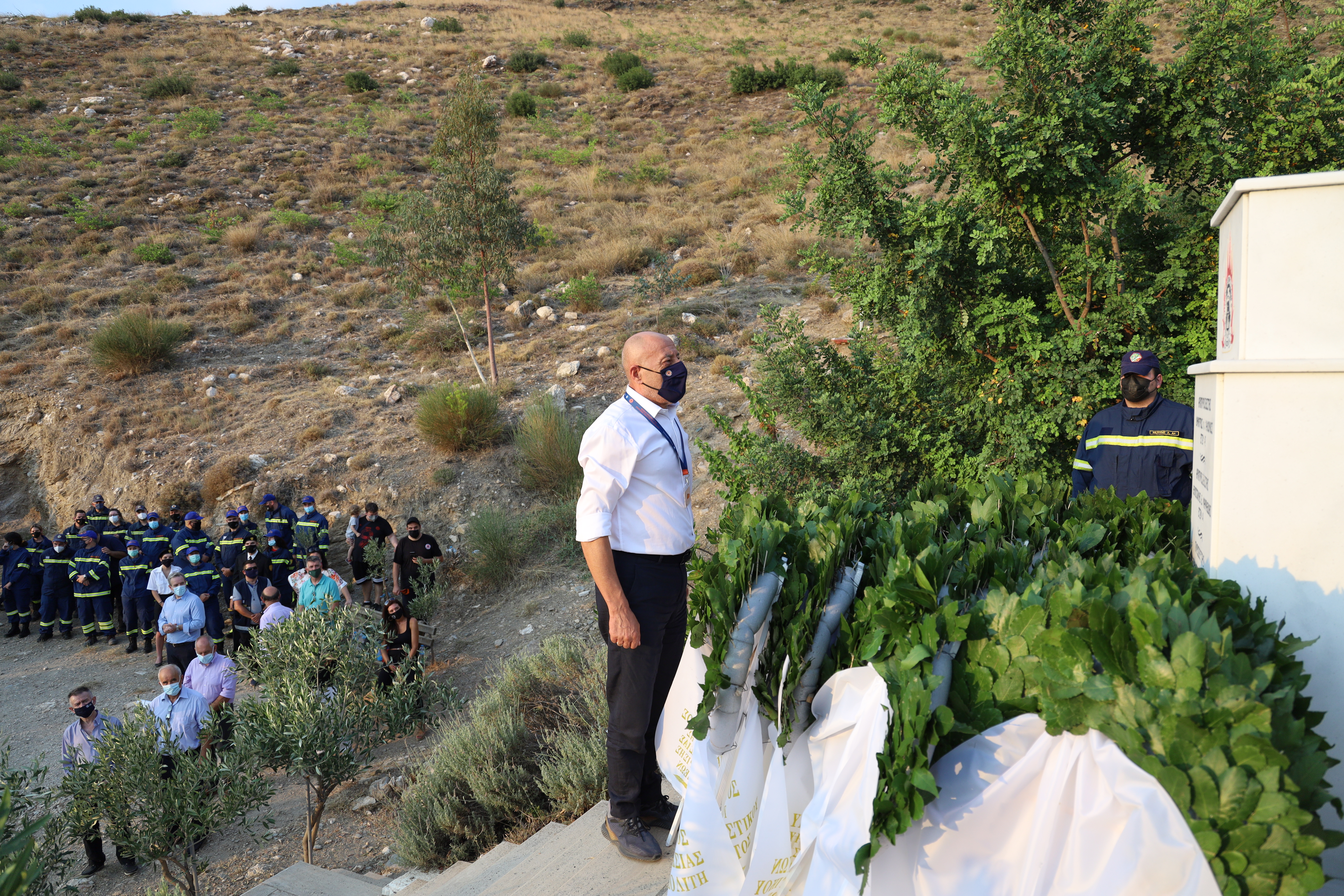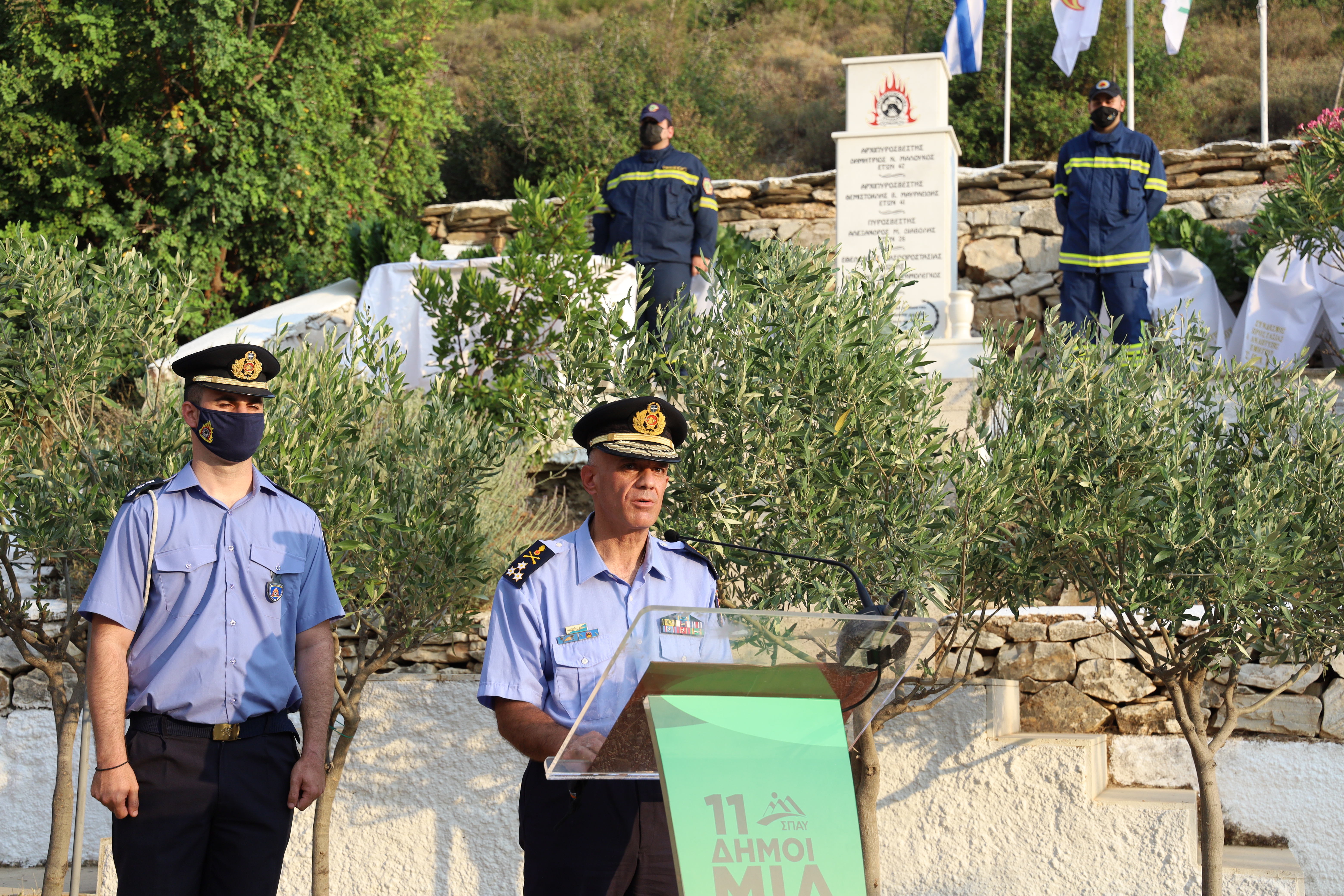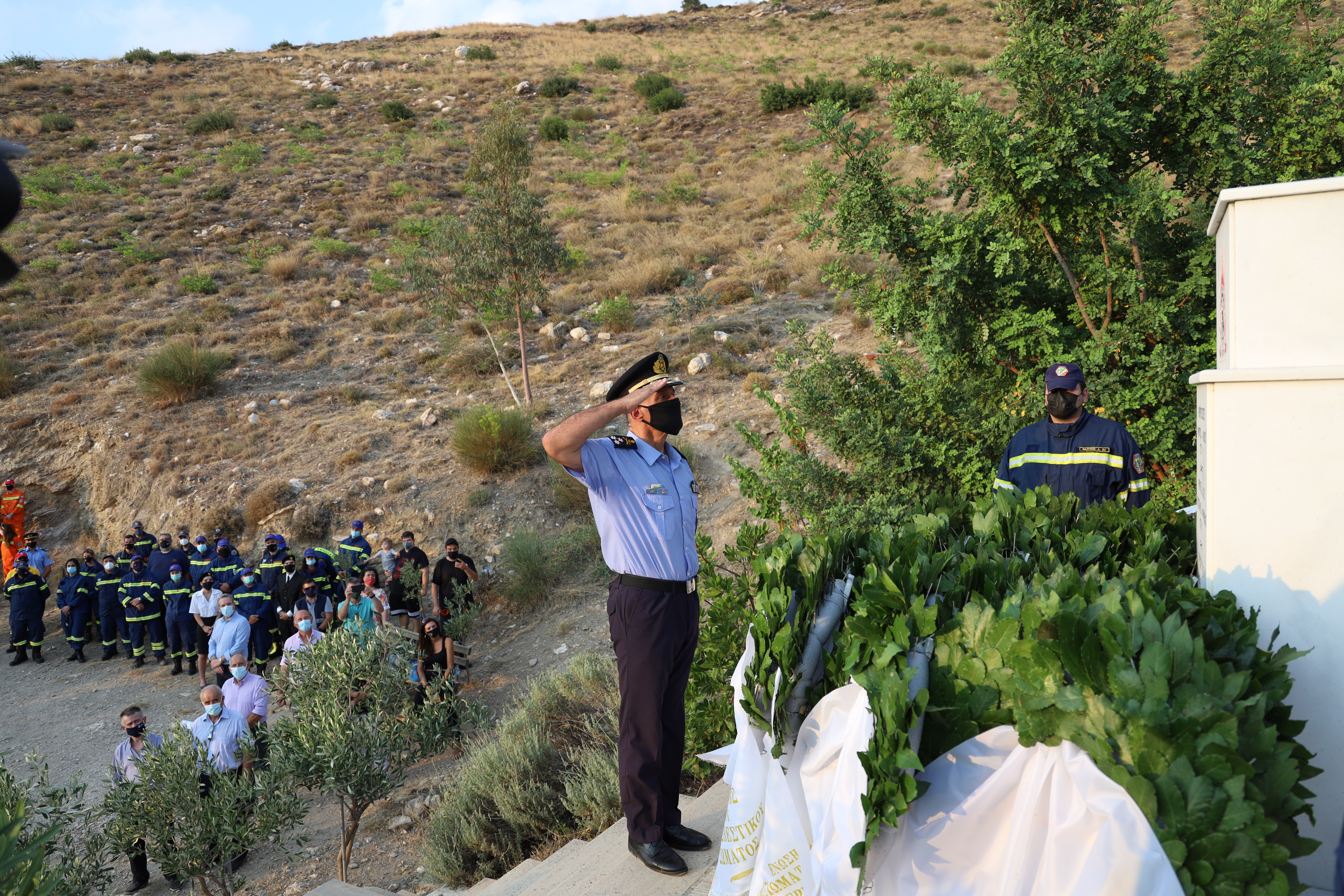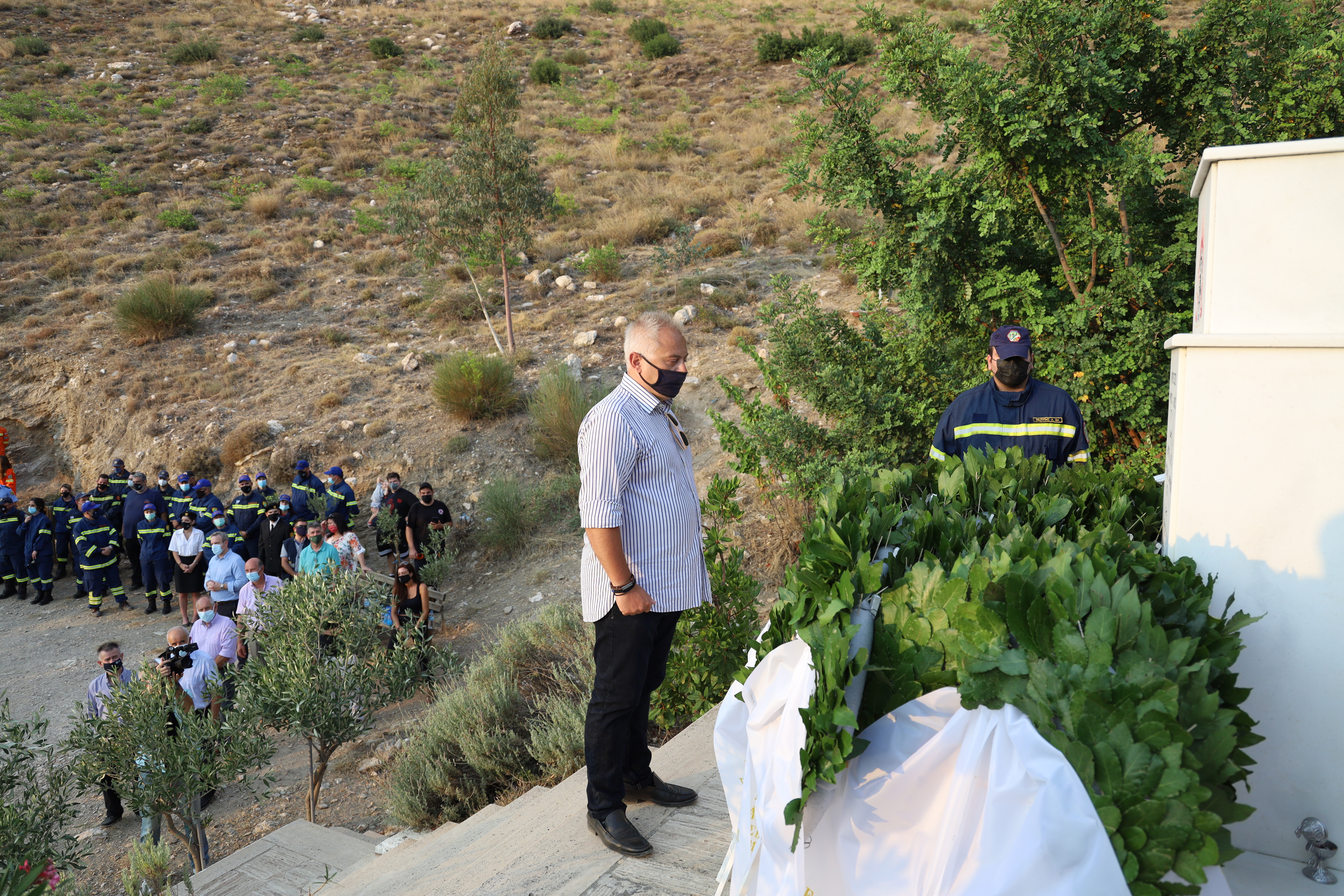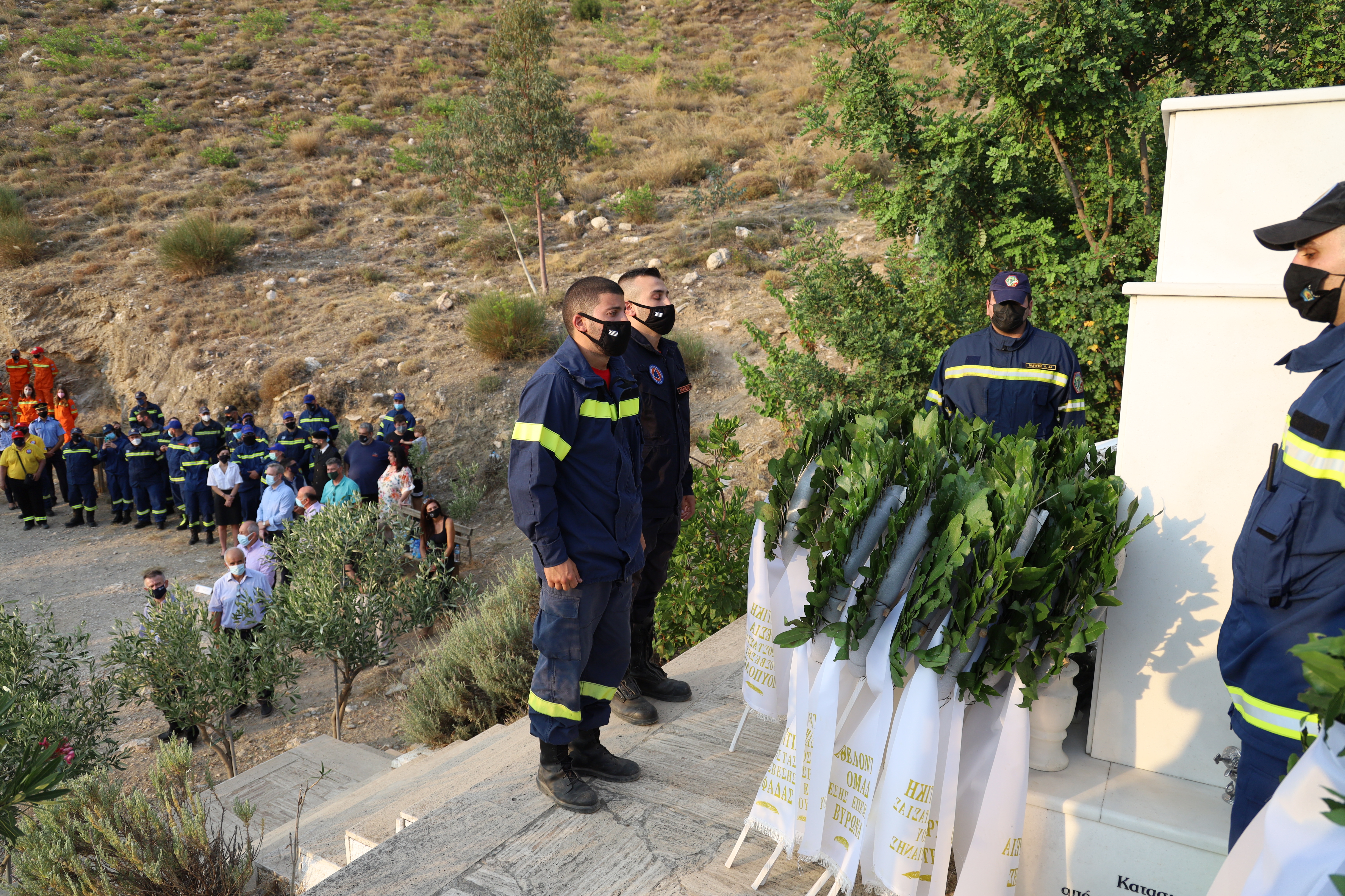 Ο Αρχηγός του Πυροσβεστικού Σώματος Αντιστράτηγος Στέφανος Κολοκούρης απηύθυνε σύντομο χαιρετισμό, τονίζοντας ότι, «…βρισκόμαστε σήμερα εδώ για να αποτίσουμε φόρο τιμής στους ήρωες μας, που έπεσαν σ’ αυτό εδώ το σημείο κατά την εκτέλεση του καθήκοντος. Δεν πρόκειται για μια τυπική διαδικασία αλλά ιερό χρέος προς τους τέσσερις αυτούς ήρωες οι οποίοι θυσιάστηκαν προσπαθώντας να σβήσουν τη μεγάλη δασική πυρκαγιά που εκδηλώθηκε στον Υμηττό στις 22-7-1998. Ο εχθρός που είχαν να αντιμετωπίσουν ύπουλος και απρόβλεπτος. Οι συνθήκες δύσκολες , ο κίνδυνος μεγάλος. Στιγμή δεν λειτούργησε το ένστικτο της αυτοσυντήρησης γιατί ως ήρωες θυσιάστηκαν και με τέλεια αυταπάρνηση τέλεσαν το καθήκον τους. Υποχρέωση μας είναι να αξιοποιήσουμε την παρακαταθήκη που άφησαν. Η καθημερινότητα της ζωής μας δεν πρέπει να αλλοιώσει την μνήμη μας. Δεν πρέπει να ξεχαστούν. Ελάχιστο χρέος μας είναι η απότιση φόρου τιμής και η δημιουργία συνθηκών για να μην υπάρξουν άλλα θύματα σε αυτόν τον άνισο αγώνα. Κλίνουμε ευλαβικά το γόνυ προς όλους τους πεσόντες. Αιωνία τους η μνήμη …»