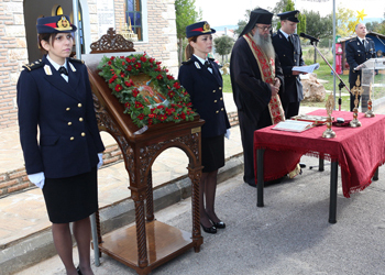 Τελέσθηκε σήμερα η δοξολογία για τον εορτασμό των Προστατών του Πυροσβεστικού Σώματος, Αγίων «Τριών Παίδων εν Καμίνω», στο παρεκκλήσι της Ζωοδόχου Πηγής, εντός των εγκαταστάσεων της 1ης Ε.Μ.Α.Κ., στην Ελευσίνα Αττικής.