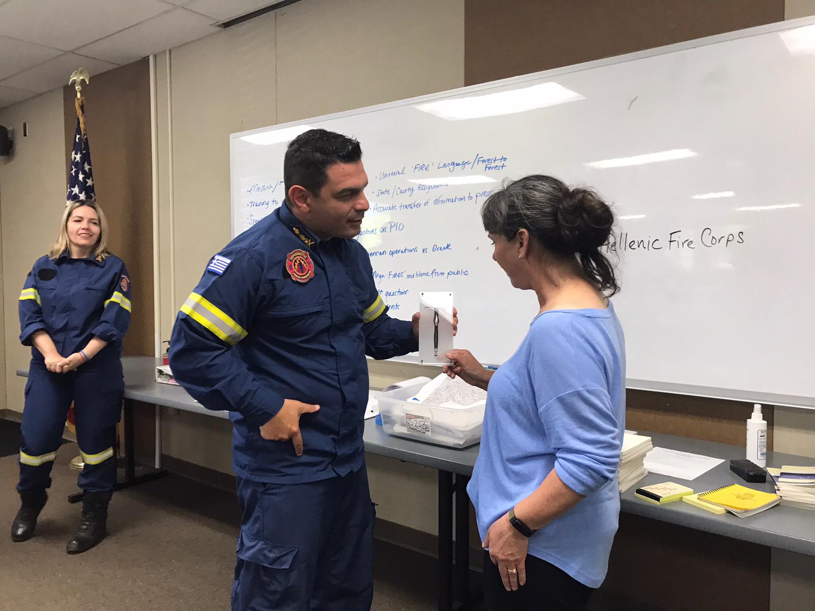 Με το πέρας της εκπαίδευσης και την απονομή των πτυχίων στους τέσσερις (4) Αξιωματικούς του Πυροσβεστικού Σώματος Ελλάδας, επιδόθηκαν αναμνηστικά δώρα στους εκπαιδευτές του προγράμματος.