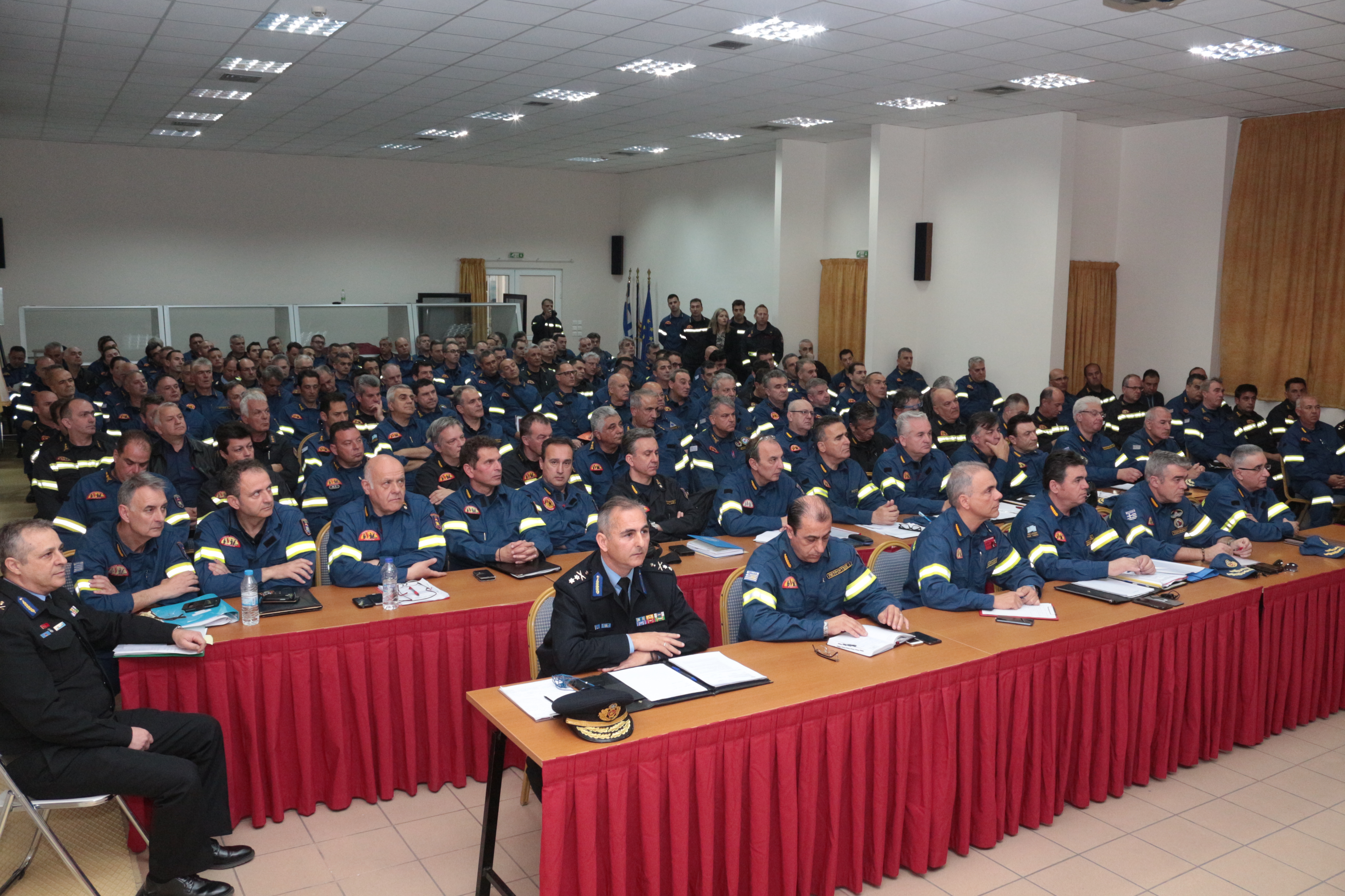 Στη σύσκεψη συμμετείχαν: ο Υπαρχηγός Επιχειρήσεων Αντιστράτηγος ΠΣ Στέφανος Κολοκούρης, ο Υπαρχηγός Υποστήριξης Αντιστράτηγος ΠΣ Κωνσταντίνος Κυριακόπουλος, ο Συντονιστής Υποστήριξης Υποστράτηγος ΠΣ Αναστάσιος Σωτήρχος, οι Συντονιστές Επιχειρήσεων Υποστράτηγοι ΠΣ Αχιλλέας Τζουβάρας, Σπυρίδων Βαρσάμης και Ιωάννης Πετρούτσος, ο Διοικητής Ε.Σ.Κ.Ε. Υποστράτηγος ΠΣ Ιάκωβος Κλεφτοσπύρος, ο Διοικητής της ΠΕ.ΠΥ.Δ. Αττικής Υποστράτηγος ΠΣ Νικόλαος Σπαής, οι Διοικητές των Περιφερειακών Πυροσβεστικών Διοικήσεων, οι Διευθυντές του 199 Σ.Ε.Κ.Υ.Π.Σ. - Κ.Ε.Π.Π., οι Διοικητές των Πυροσβεστικών Υπηρεσιών Αθηνών, Πειραιώς, Ανατολικής και Δυτικής Αττικής, της 1ης Ε.Μ.Α.Κ. οι Διευθυντές Διευθύνσεων του Α.Π.Σ., ο Διοικητής της Υ.Ε.Μ.Π.Σ., ο Διοικητής της Σχολής Ανθυποπυραγών της Πυροσβεστικής Ακαδημίας, ο Διευθυντής της Δ.Α.Ε.Ε., οι Διοικητές Πυροσβεστικών Σταθμών Αττικής και λοιπών Πυροσβεστικών Υπηρεσιών της Επικράτειας.