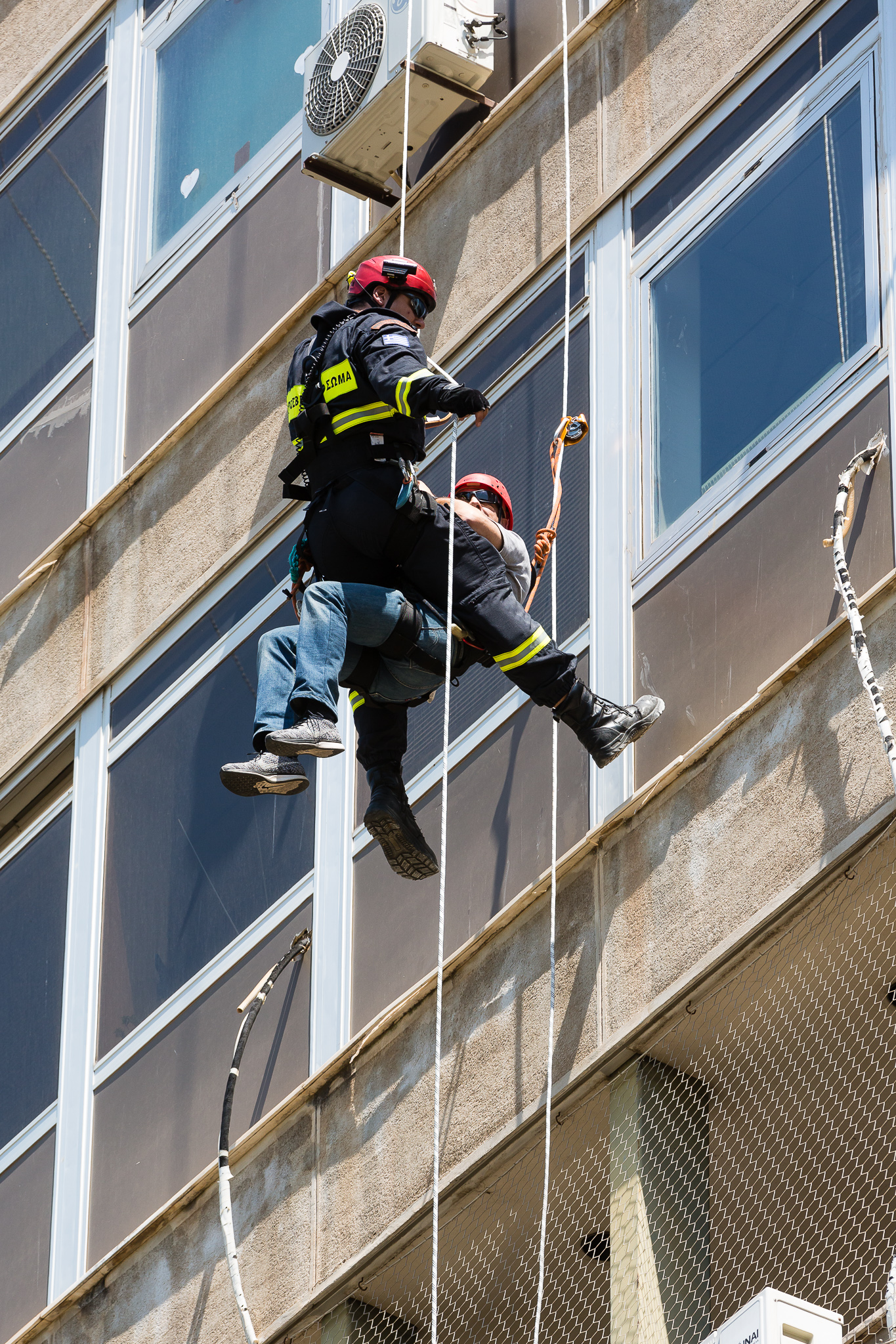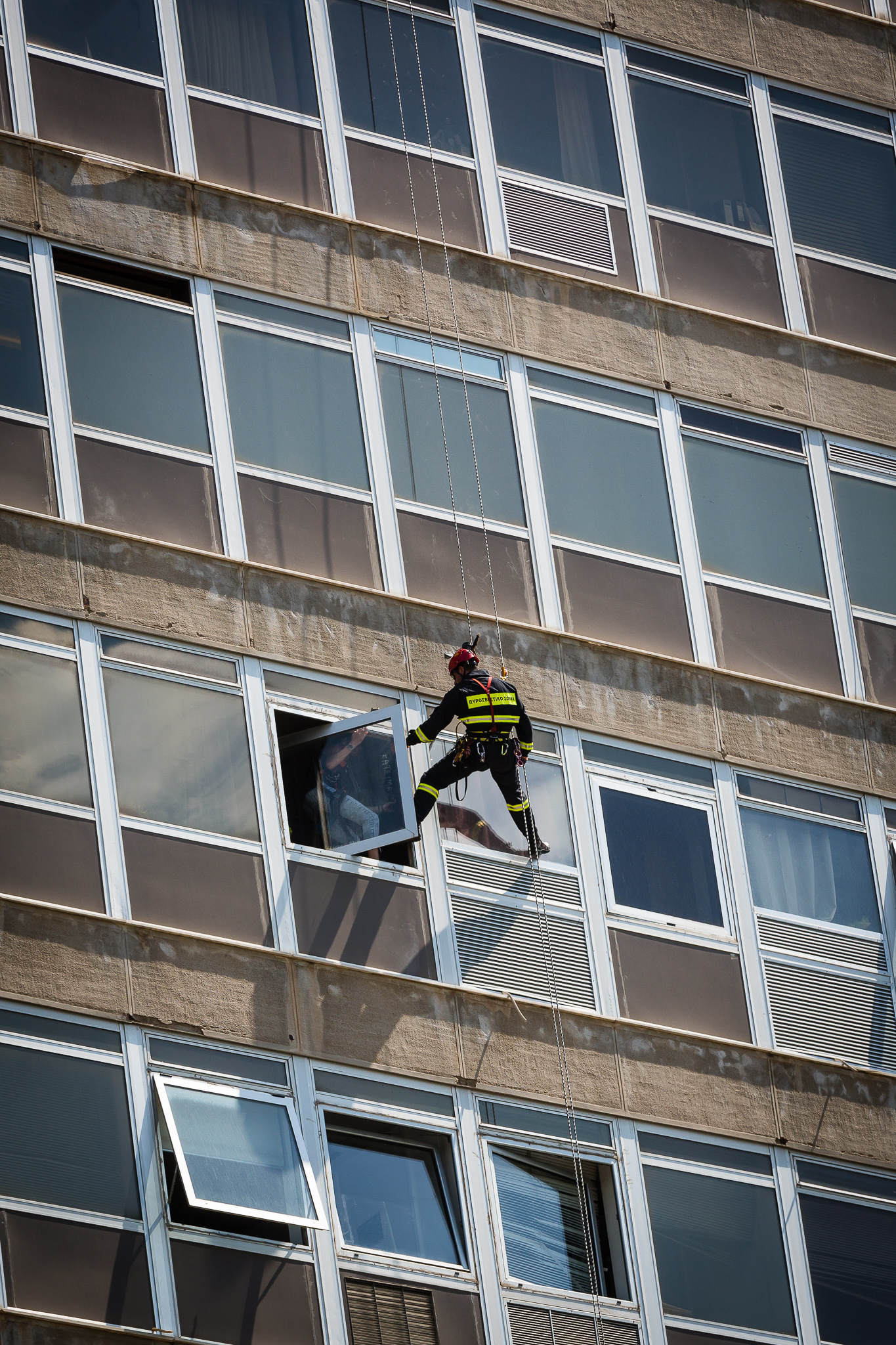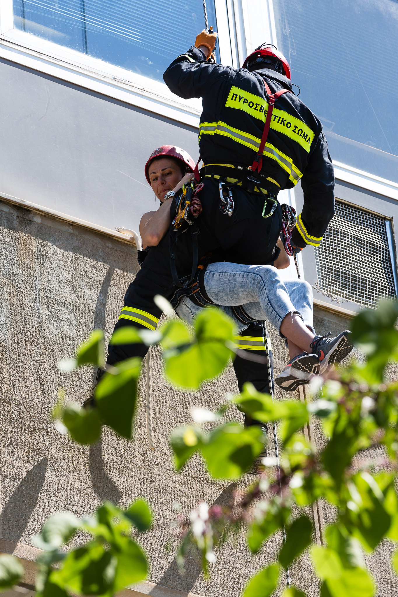 Ταυτόχρονα, εγκλωβισμένα άτομα γίνονται αντιληπτά από τους διασώστες στον 7ο και 8ο όροφο, για την διάσωση των οποίων, μία ομάδα της Ε.Μ.Α.Κ. στήνει 2 διασωστικές γραμμές από την ταράτσα του κτιρίου και ενεργεί διάσωση από τα παράθυρα, με κατακόρυφους διασωστικούς κάλους (σχοινιά). Τραυματισμένα και εγκλωβισμένα άτομα που εντοπίζονται από τους πυροσβέστες που βρίσκονται για κατάσβεση μέσα στο κτίριο οδηγούνται με ασφάλεια εκτός του κτιρίου. Οι πυροσβέστες ελέγχουν όλους τους ορόφους για πιθανή ύπαρξη ατόμων ή άλλων εστιών χωρίς να διαπιστωθούν ανησυχητικά ευρήματα και επιτυγχάνουν την πλήρη κατάσβεση της πυρκαγιάς.