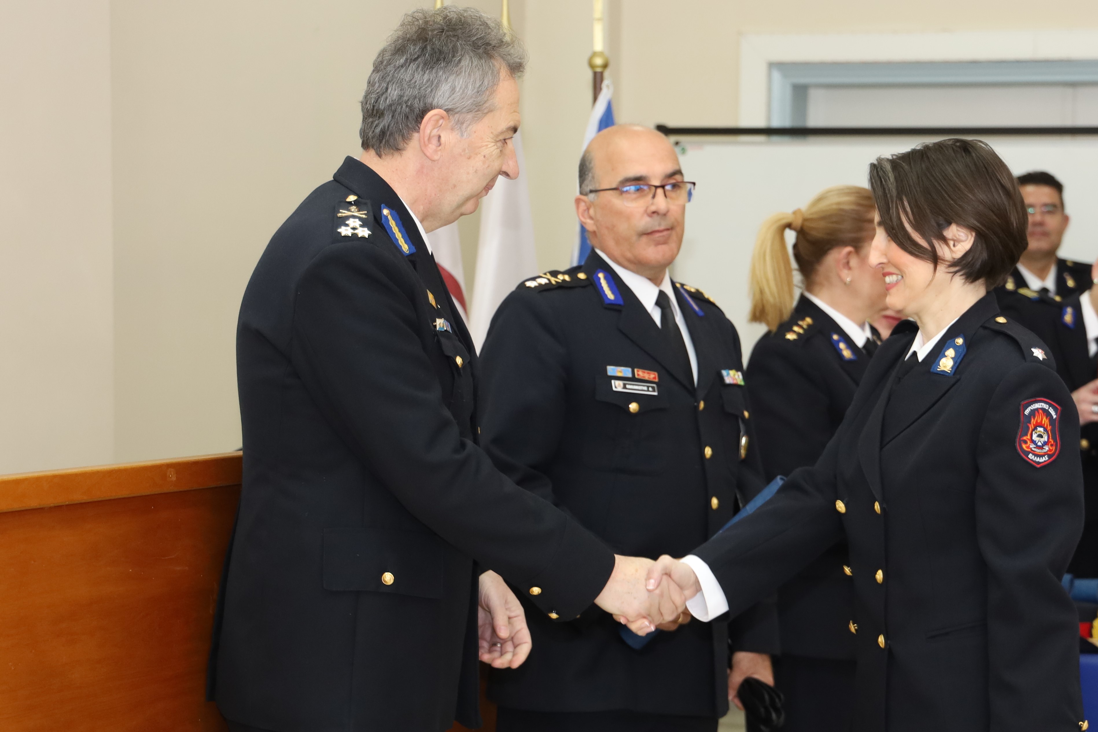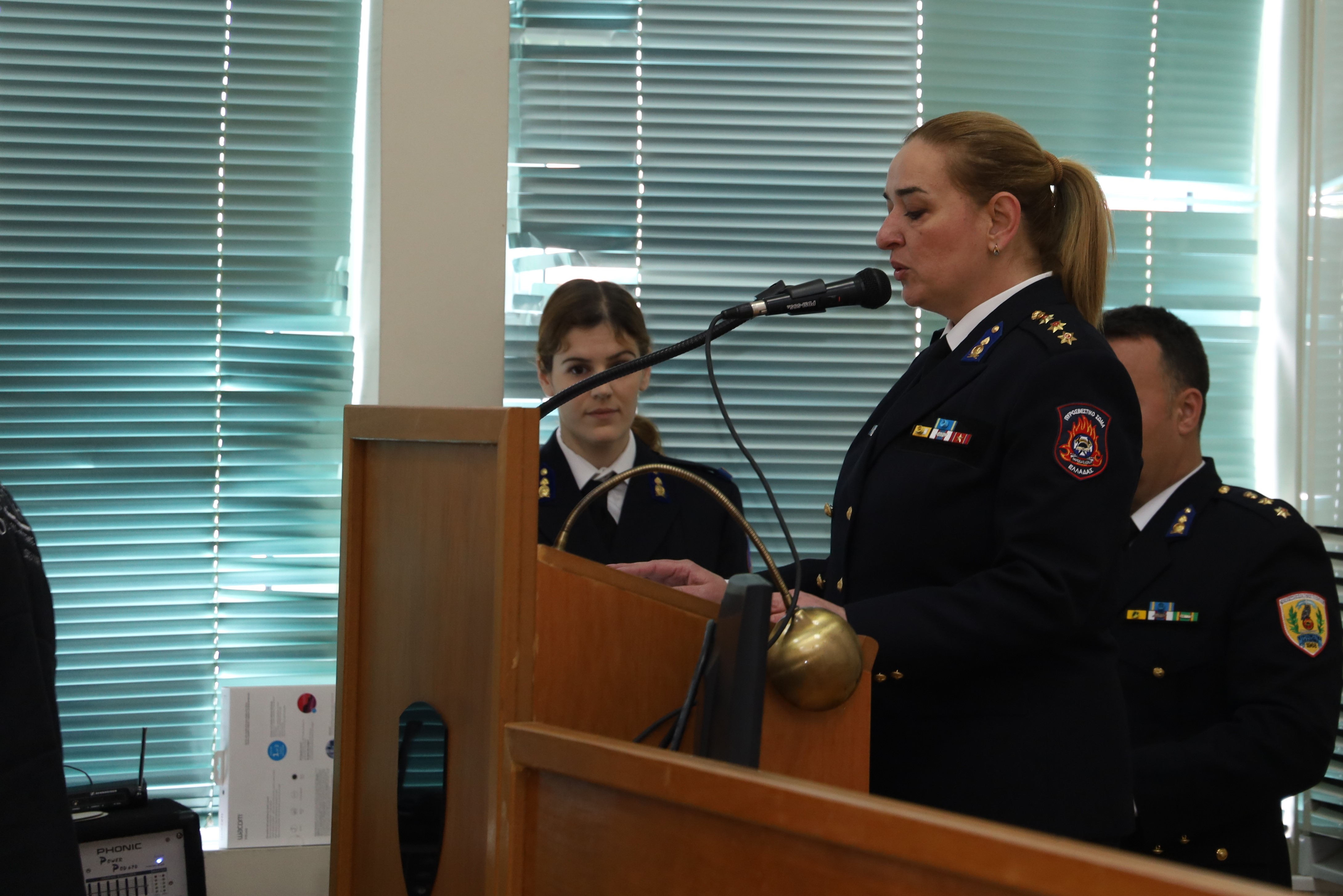 Στο τέλος της ομιλίας της η διοικητής της Σχολής Επιμόρφωσης και Μετεκπαίδευσης του Ειδικού Τμήματος Πυρονόμων συνεχάρη στους απόφοιτους για την ευδόκιμη αποφοίτηση τους και τους ευχήθηκε Καλό Πάσχα και Καλή Ανάσταση.