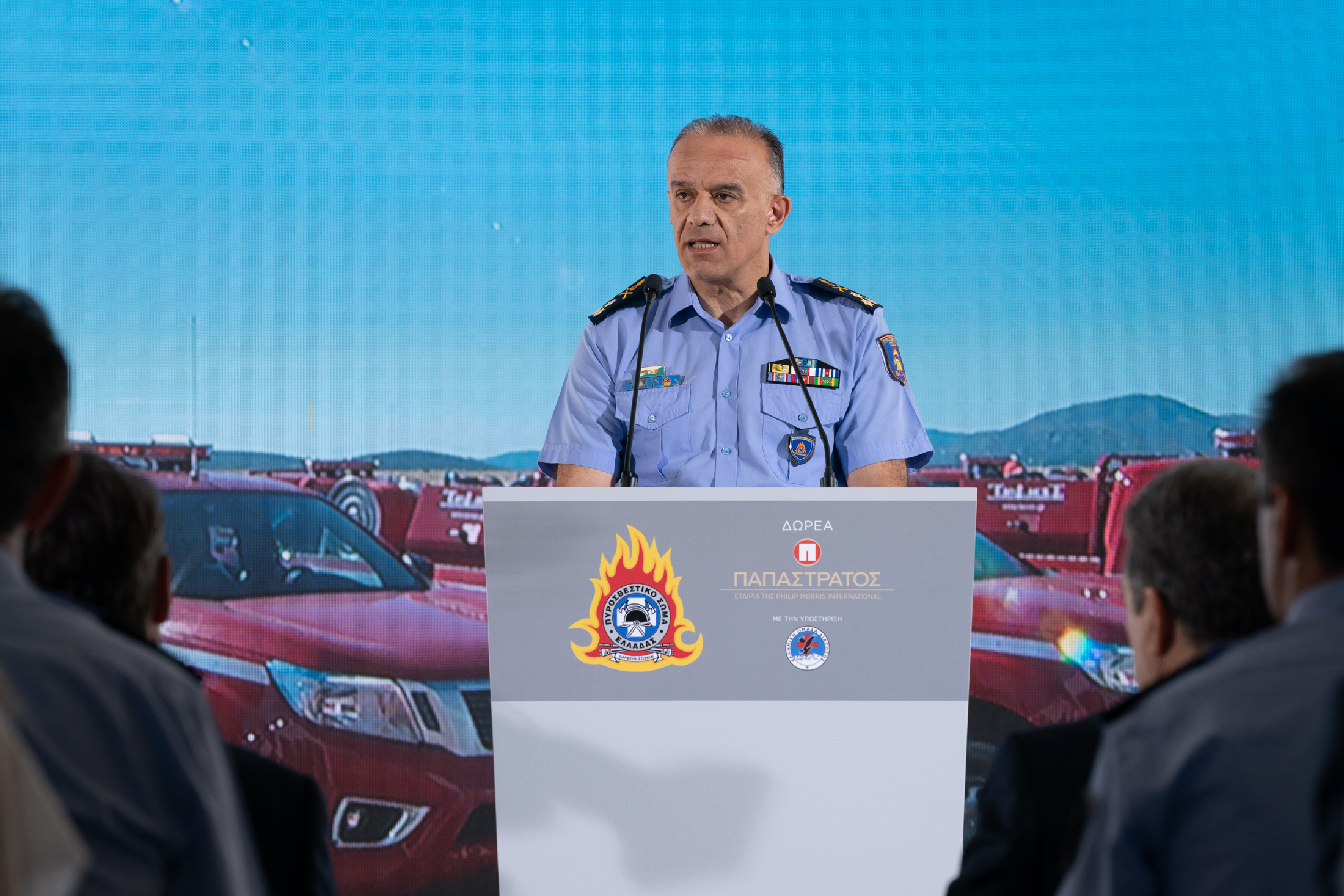 Ο Αρχηγός του Πυροσβεστικού Σώματος Αντιστράτηγος Στέφανος Κολοκούρης, στην ομιλία του ανέφερε ότι, «…η σημερινή ημέρα είναι ξεχωριστή και ιδιαίτερη για μένα προσωπικά, για όλο το Πυροσβεστικό Σώμα και την πολιτική προστασία. Η δωρεά στο Πυροσβεστικό Σώμα είκοσι πυροσβεστικών οχημάτων, από την εταιρεία Παπαστράτος, με την υποστήριξη της Ελληνικής Ομάδας Διάσωσης, η αξία των οποίων αγγίζει το 1 εκατομμύριο ευρώ, προσδιορίζει απόλυτα το ουσιαστικό μέγεθός της. Οι αρμοδιότητες του Πυροσβεστικού Σώματος, η φύση της αποστολής και η μορφή του έργου που προσφέρει, καθιστούν αναγκαίο τον κάθε μορφής μηχανολογικό εξοπλισμό, ο οποίος αποτελεί αναγκαία προϋπόθεση, ώστε το Σώμα να ανταποκριθεί στις συνεχώς αυξανόμενες απαιτήσεις των συμβάντων που καλείται να διαχειριστεί». Συνεχίζοντας τόνισε ότι, «…τα οχήματα αυτά, πρόκειται να χρησιμοποιηθούν από το Πυροσβεστικό Σώμα με κύριο έργο την περιπολία εντός δασικών εκτάσεων για την καταπολέμηση των δασικών πυρκαγιών εν τη γενέσει τους, καθώς είναι οχήματα εκτός δρόμου ,μικρά και ευέλικτα. Οι δυνατότητές τους και τα τεχνικά χαρακτηριστικά τους εξασφαλίζουν αποτελεσματικότητα και κατά συνέπεια, συμβάλουν ουσιαστικά στην τιτάνια προσπάθεια διάσωσης των δασών μας. Η κατανομή τους θα γίνει σε όλη την Ελλάδα, ανάλογα με τις πραγματικές ανάγκες κάθε περιφέρειας. Κλείνοντας την ομιλία του ο Αρχηγός του Πυροσβεστικού Σώματος ευχαρίστησε για μια ακόμη φορά την εταιρεία Παπαστράτος και την Ελληνική Ομάδα Διάσωσης, οι οποίοι στέκονται αρωγοί και συνοδοιπόροι στο απαιτητικό και επικίνδυνο έργο του Πυροσβεστικού Σώματος.