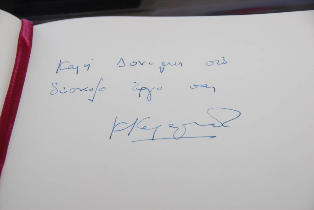 Ο Πρωθυπουργός δεν παρέλειψε να υπογράψει και στο βιβλίο επισκεπτών του περιπτέρου, όπου σημείωσε τα εξής: «Καλή δύναμη στο δύσκολο έργο σας»