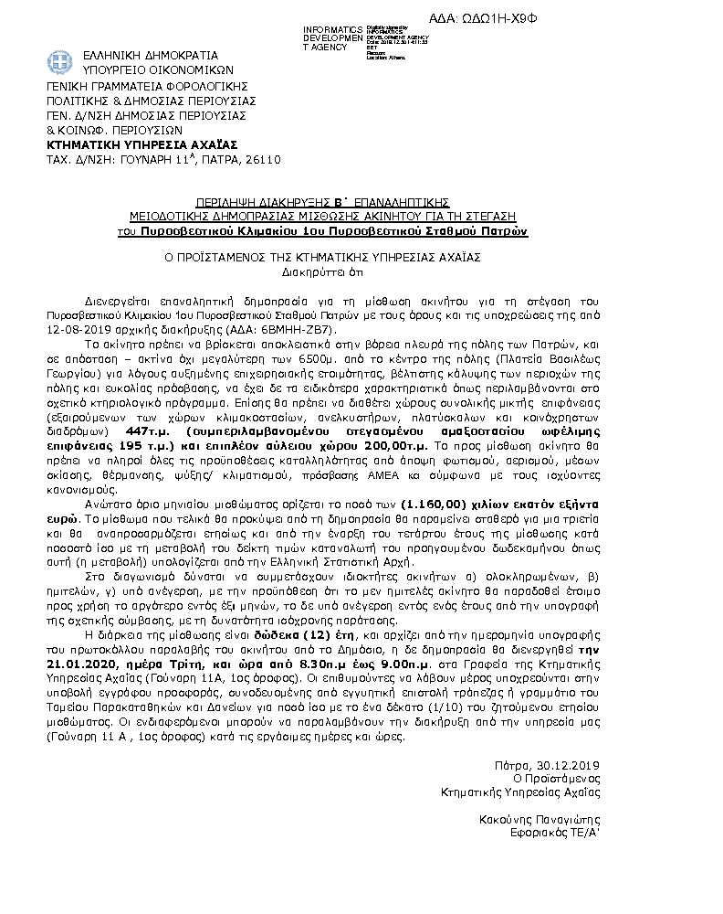 Ανάρτηση Διακήρυξης Β’ Επαναληπτικής Μειοδοτικής Δημοπρασίας Μίσθωσης Ακινήτου 1ου Π.Σ. Πατρών