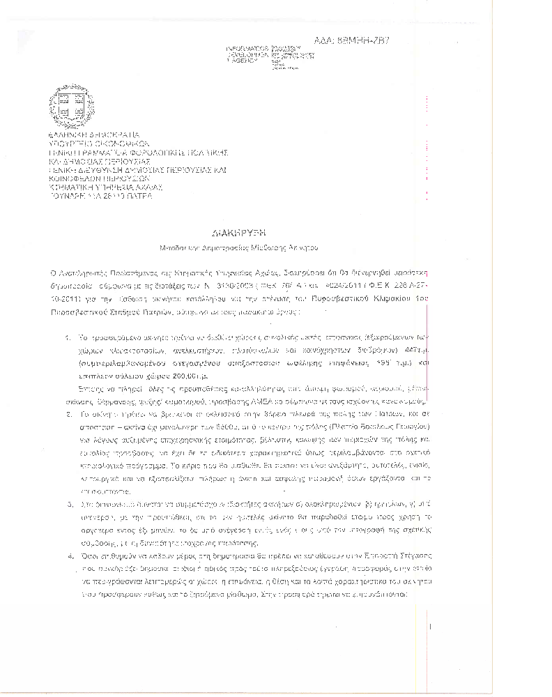 ΔΙΑΚΗΡΥΞΗ ΔΗΜΟΠΡΑΣΙΑΣ ΜΙΣΘΩΣΗΣ ΑΚΙΝΗΤΟΥ 1ου Π.Σ. ΠΑΤΡΩΝ